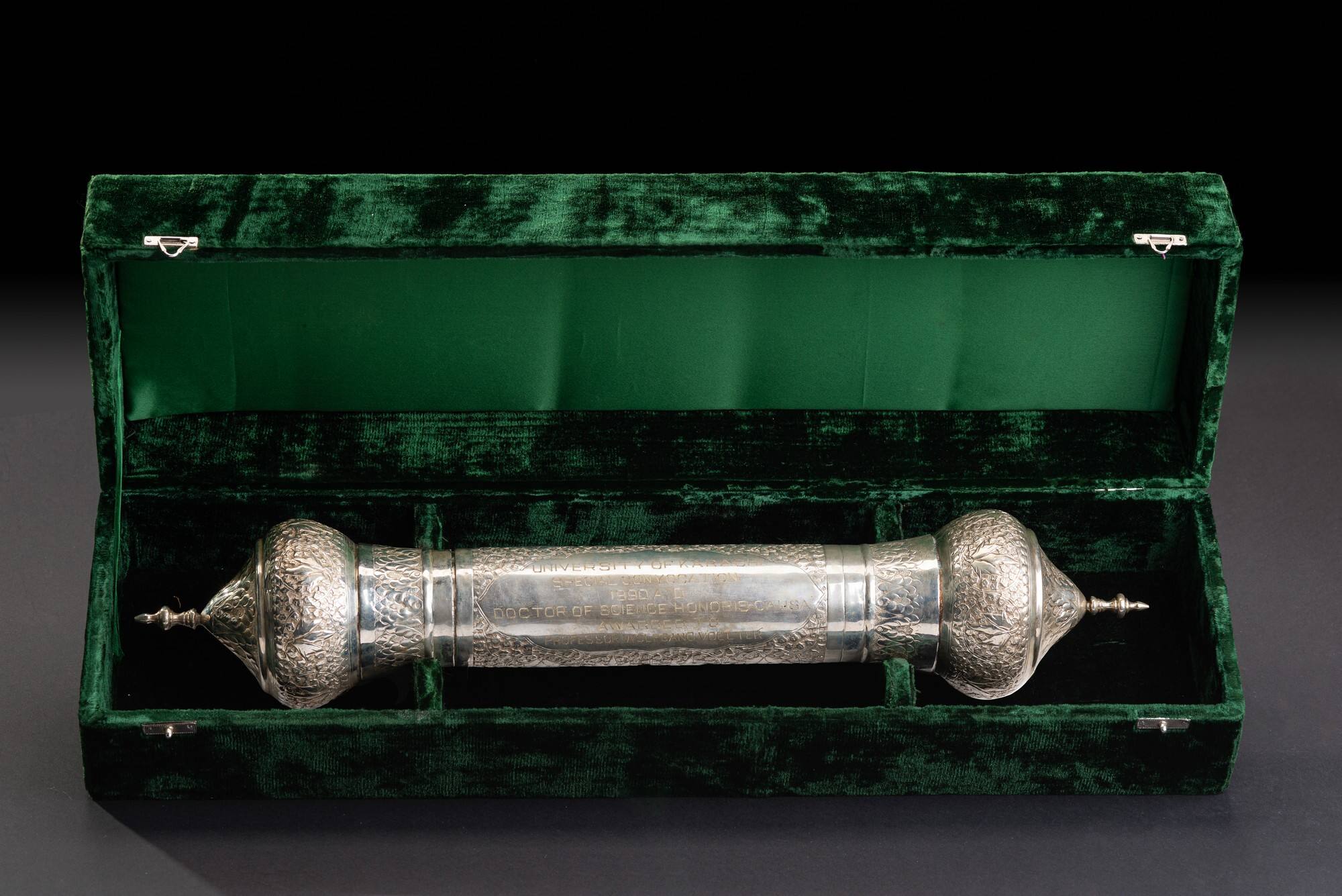 Silberkapsel für die Ehrendoktorurkunde der Universität Karachi für Prof. Dr. Dr. h.c. mult. Wolfgang Voelter