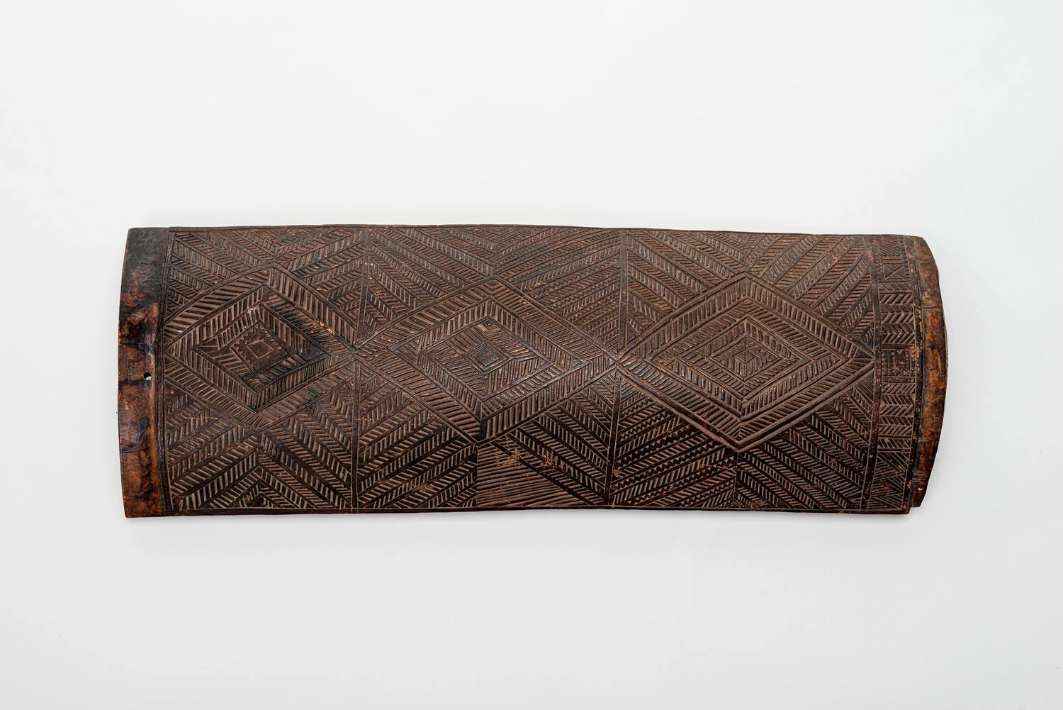 DescriptionGroße Holzmatrize zum Bedrucken von Rindenbaststoffen.DimensionsDurchmesser: 7 cm
