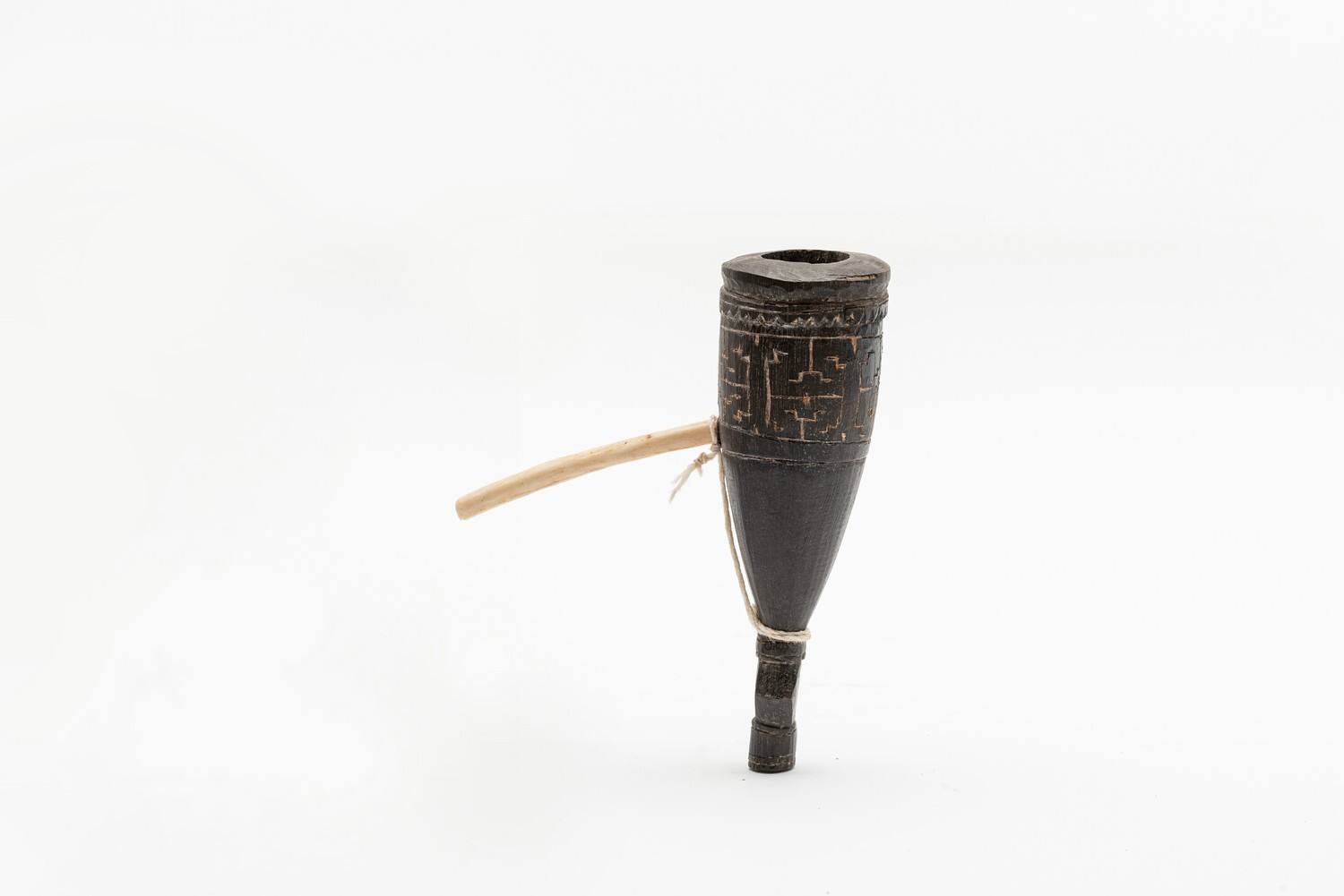 DescriptionDie Tabakspfeife wurde im Jahr 1983 in Callao, Yarina Cocha in Peru geschnitzt. In der Herkunftsgesellschaft der Shipibo Conibo wird die Pfeife als "shinitapo" bezeichnet. In der Regel wird die Schnitzarbeit von Männern geleistet und die Erstellung der Muster von den Frauen.DimensionsDurchmesser (Pfeifenkopf): 3,8 cm