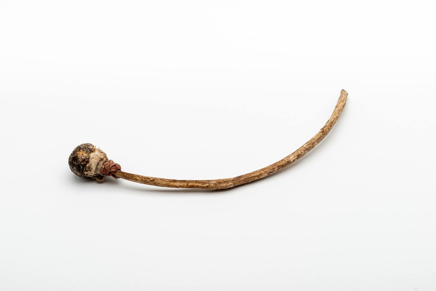 DescriptionKopal an einer Rippe eines Tapirs. Mit diesem Töpferwerkzeug werden die Innenflächen der Gefäße sofort nach dem Brand gefirnisst. Das Kopalstück schmilzt und zerfließt auf der noch heißen Gefäßwand. Dabei muss äußerst schnell gearbeitet werden. Mehrere Frauen arbeiten gleichzeitig an einem größeren Gefäß, um die kurze Zeitspanne der optimalen Temperatur gut auszunutzen.DimensionsL x B: 34,5 × 4 cm