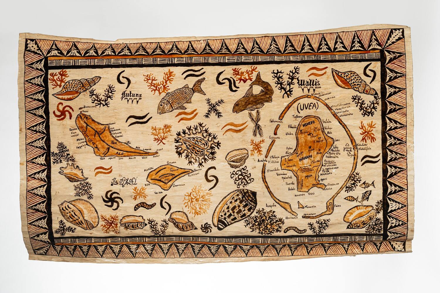 DescriptionDie Tapa zeigt in einer rechteckigen Fläche, umrahmt von der üblichen ornamentalen Bordüre eine Fantasiekarte der Inseln Wallis und Futuna (+ Alofi), die durch gegenständliche Ausschmückungen (Seeschnecken, Seesterne, Fische und Korallen) ergänzt wird.DimensionsL x B: 141 × 35,5 cm