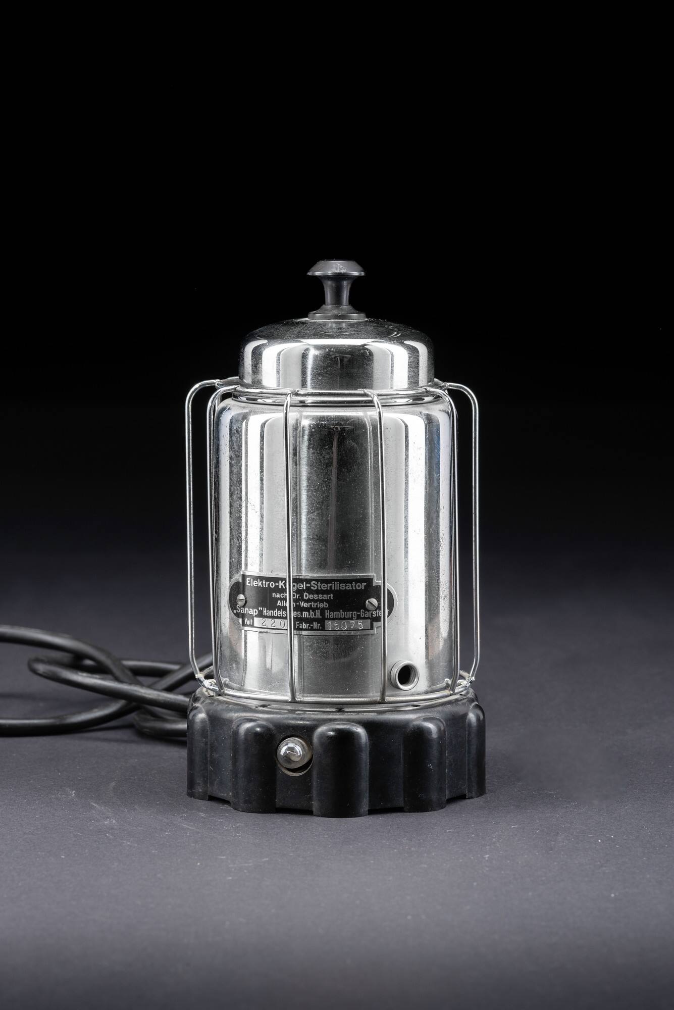 DescriptionDer Kugelsterilisator nach Dr. Dessart diente zur (Nach-) Sterilisation von Hand- und Wurzelkanalinstrumenten. Der Behälter wurde mit kleinen Glaskugeln gefüllt und erhitzt. Eingetauchte Instrumentenenden sollten in wenigen Sekunden keimfrei werden.DimensionsHöhe: 18,5 cm
