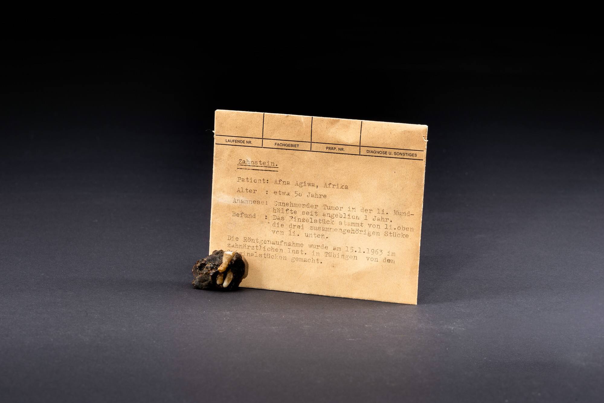 Description"Zahnstein: Patient: Afna A., Afrika Alter: etwa 50 Jahre Anamnese: Zunehmender Tumor in der li. Mundhälfte seit angeblich 1 Jahr. Befund: Das Einzelstück stammt von li. Oben die drei zusammengehörigen Stücke von li. Unten. Die Röntgenaufnahme wurde am 15.1.1963 im zahnärztlichen Inst. in Tübingen von den Originalstücken gemacht."DimensionsH x B x T: 1,78 × 2,46 × 3,29 cm