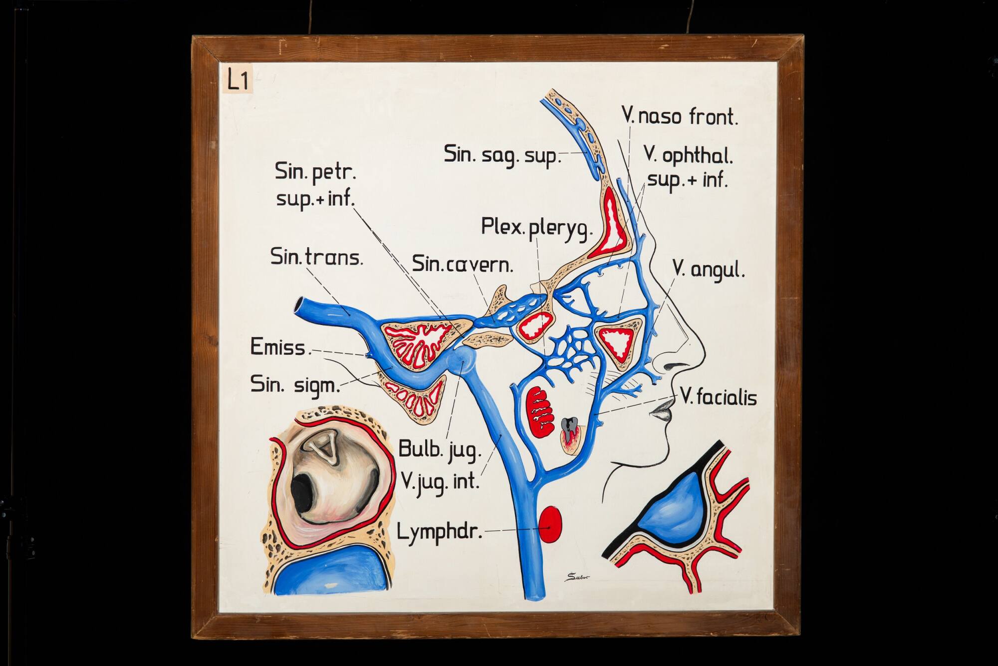 DescriptionDie venöse Drainage des Kopfes erfolgt hauptsächlich über die „innere Drosselvene“ (Vena jugularis interna). Sie leitet das sauerstoffarme Blut aus dem Gehirn (über den Sinus transversus und Sinus sigmoideus) und dem Kopf-Hals-Bereich (etwa Vena facialis) zurück zum Herz. Links unten ist der Blick in die Paukenhöhle des Mittelohres dargestellt. Man erkennt am Dach den Steigbügel als letztes Gehörknöchelchen sowie die enge Beziehung zur Vena jugularis interna.DimensionsH x B: 142 × 142 cm