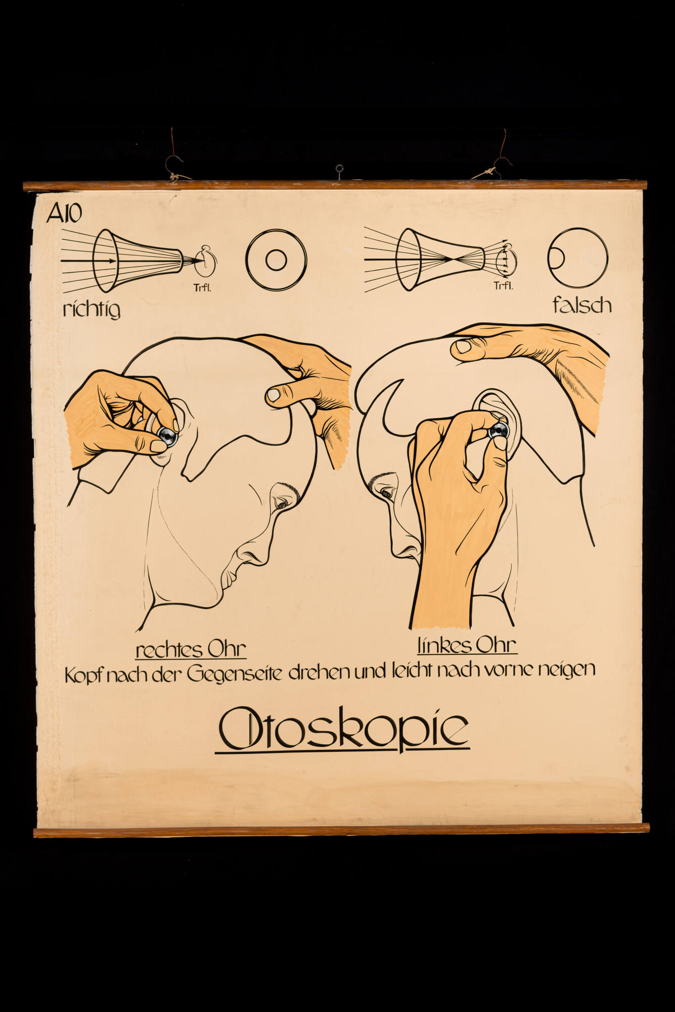 DescriptionSchematische Darstellung der klinischen Untersuchung mit einem Ohrtrichter: Zur Beurteilung des Trommelfells und des Gehörgangs wird der Kopf auf die gegenüberliegende Schulter und leicht nach vorne gekippt. Der doppelt-S-förmig gekrümmte Gehörgang wird durch den Trichter offengehalten. Mittels eines Hohlspiegels wird Licht in den Gehörgang eingespielt.