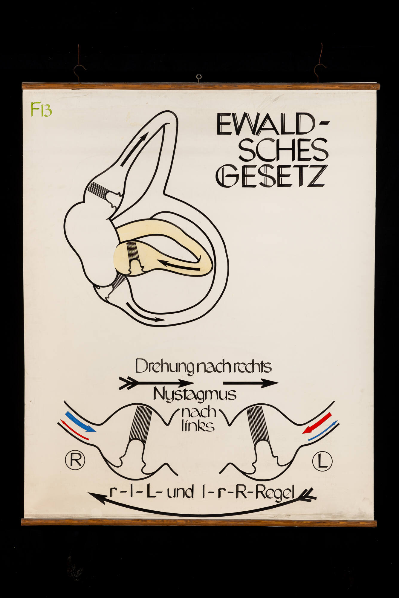 DescriptionEine Drehung in der jeweiligen Ebene des Bogenganges bewirkt einen Nystagmus in die Gegenrichtung. Der funktionelle Antagonismus zwischen der horizontalen und den beiden vertikalen Bogengangsampullen trägt die Bezeichnung „Ewaldsches Gesetz“ (nach Ernst Julius Richard Ewald, 1855–1921, deutscher Physiologe).DimensionsH x B: 148 × 118 cm