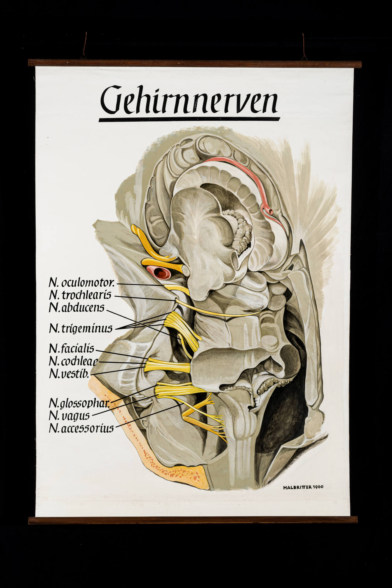 DescriptionDargestellt sind die zwölf Hirnnerven, wobei in der Abbildung neun beschriftet sind (Nervus vestibularis und Nervus cochlearis werden in der Regel als Nervus vestibulocochlearis zusammengefasst). Die Hirnnerven sind ein Teil des peripheren Nervensystems und entspringen direkt aus dem Gehirn. Die Abbildung zeigt Teile des Zwischenhirns und des Hirnstamms sowie die Austrittspunkte, an denen die zwölf Hirnnerven an die Hirnoberfläche kommen. Durch verschiedene Öffnungen verlassen die Hirnnerven den Gehirnschädel und versorgen ihre Effektororgane.