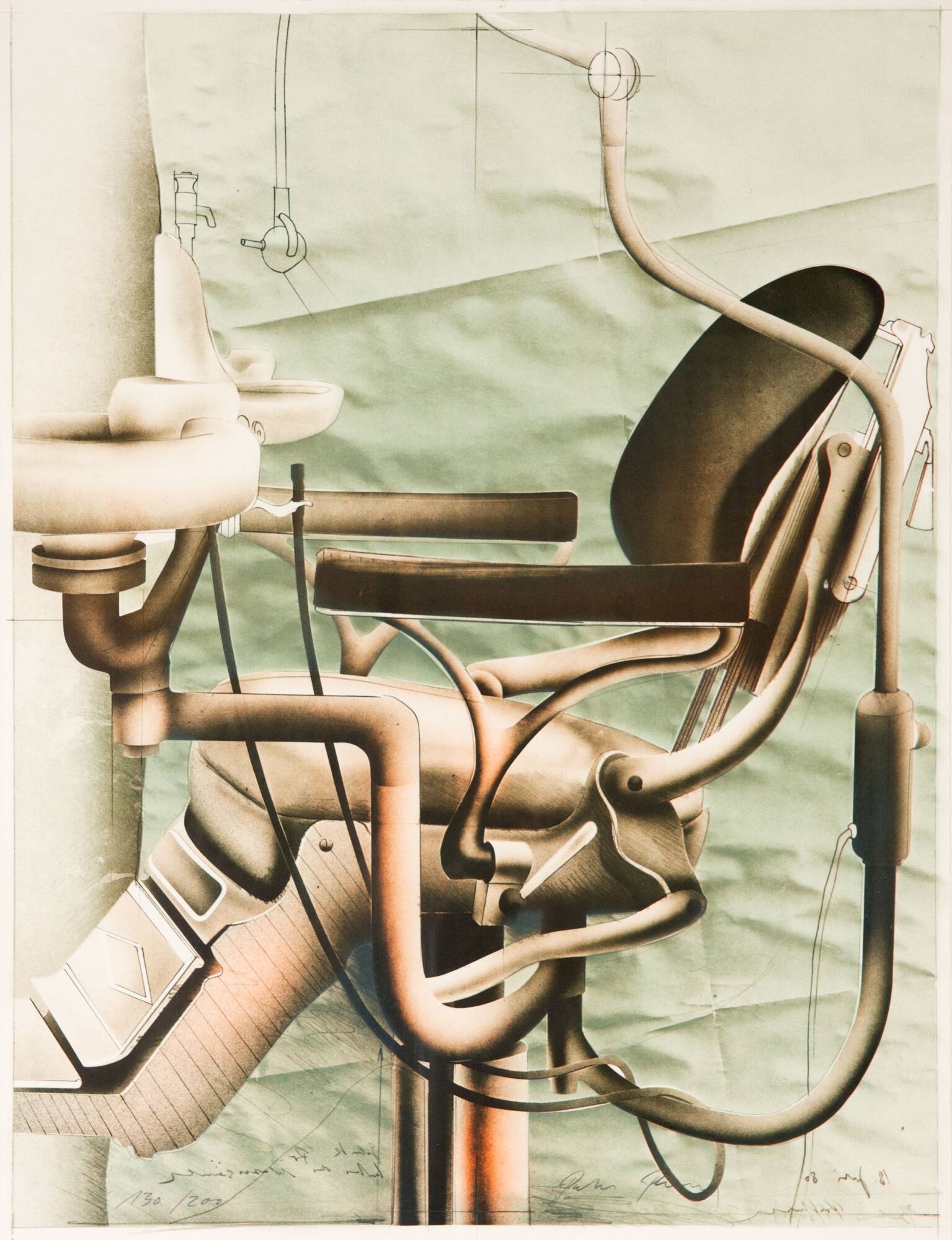 DescriptionDer Künstler Peter Paul zählte als Schüler Paul Wunderlichs (1927–2010) zu den bekanntesten Vertretern der sogenannten „Hamburger Schule“ nach 1945. Einen Namen machte er sich als selbstständig arbeitender Graphiker, insbesondere durch seine Farblithographien mit ihrer kühlen, manchmal surrealen Ästhetik; sie waren seit 1971 in zahlreichen Einzel- und Gruppenausstellungen im In- und Ausland zu sehen. Auch galt Peter Paul als Chronist der Vergänglichkeit, wie diese Farblithographie eines Zahnarztstuhles zeigt, die uns an Zahnarztbesuche in den Nachkriegs Jahrzehnten erinnert. Diese Erinnerung steigern die in der Ausstellung des zahnmedizinischen Museums gezeigten historischen Behandlungsstühle noch unmittelbarer. Gleichzeitig jedoch schafft die traumhafte Darstellung und Verunklärung eines solch nüchternen, technischen Gegenstands – der kaum je als künstlerisches Motiv gewählt wurde – durch die Papierstruktur des Hintergrunds beträchtliche Distanz und führt die so erzeugte mediale Brechung deutlich vor Augen. Die Graphik ist eine Schenkung des Tübinger Zahnarztes Dr. Jörg Schwitalla, der sein Studium an der Tübinger Universitätsklinik für Zahn-, Mund- und Kieferheilkunde absolvierte.DimensionsH x B: 66 × 50,5 cm