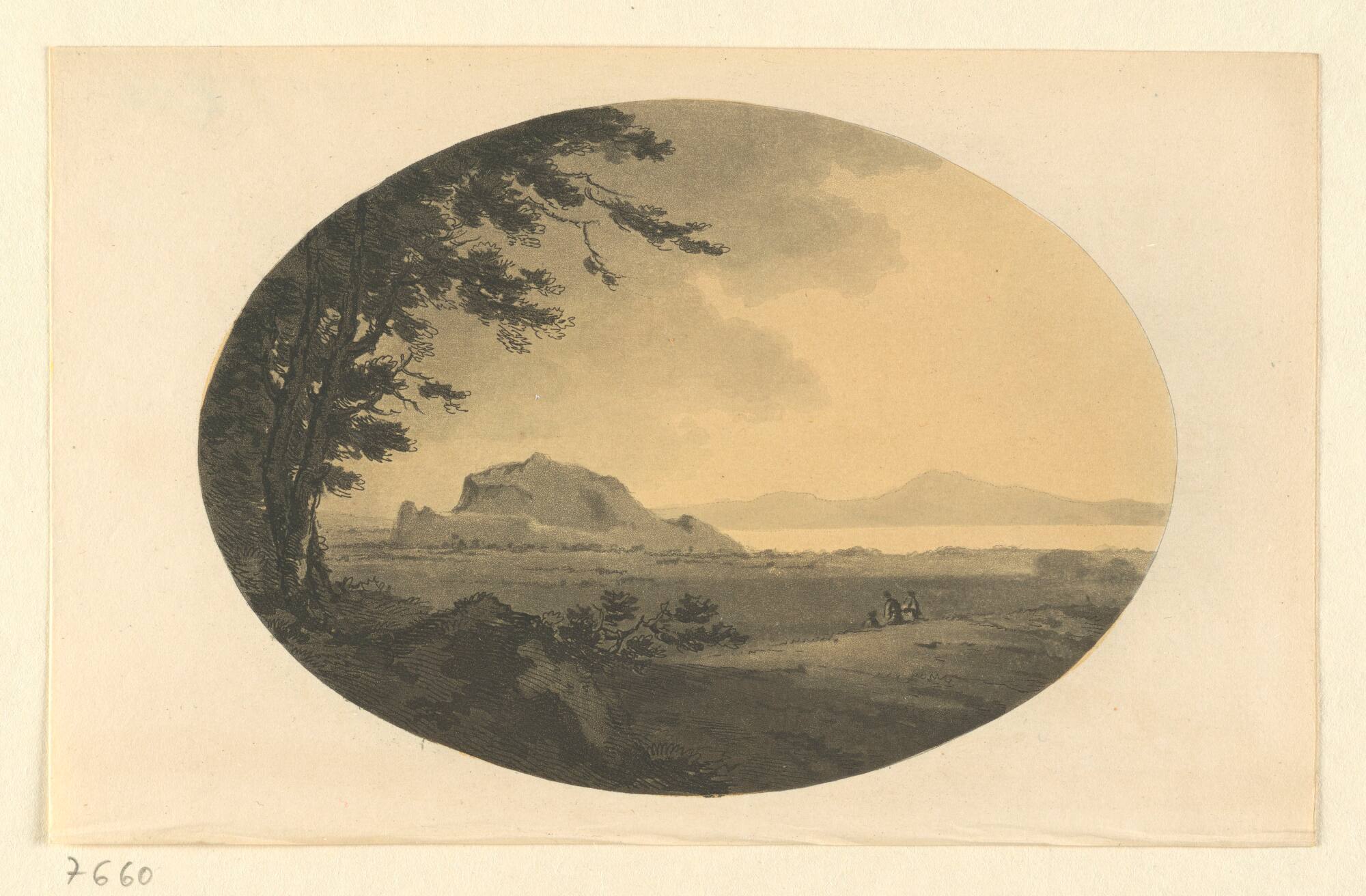 DescriptionLandschaftsdarstellung in ovaler Bildform: Vor Bergen und einem Gewässer finden sich drei Figuren. Ein Baum im Vordergrund links rahmt die Szene.DimensionsH x B (Blatt): 135 × 215 mm