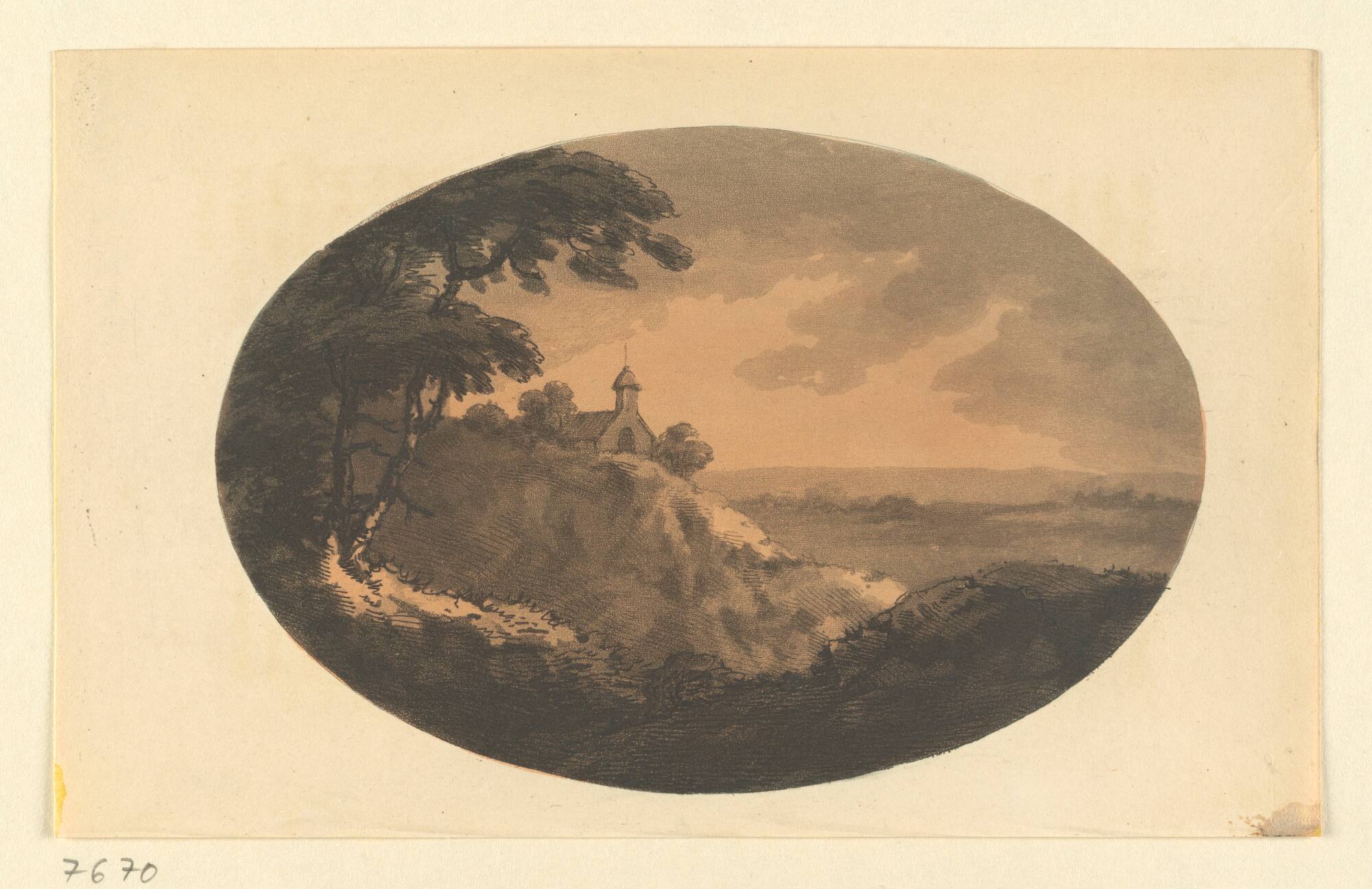 DescriptionLandschaftsdarstellung in ovaler Bildform: Berglandschaft mit Kirche und Bäumen.DimensionsH x B (Blatt): 134 × 215 mm