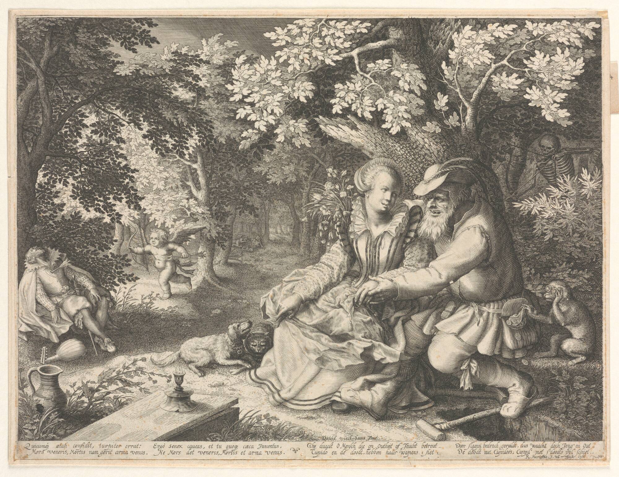 Waldlandschaft mit Frau und altem Mann, Amor und Tod schießen Pfeile