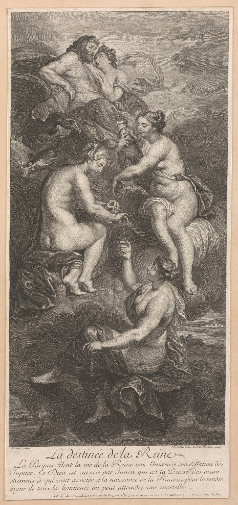 Les Parques filent la vie de la Reine sous l'heureuse constellation de / Jupiter. Ce Dieu est caressé par Junon, qui est la Déesse des accou- / chemens, et qui veut assister à la naissance de la Princesse pour la rendre digne / de tous les honneurs ou peut atteindre une mortelle .