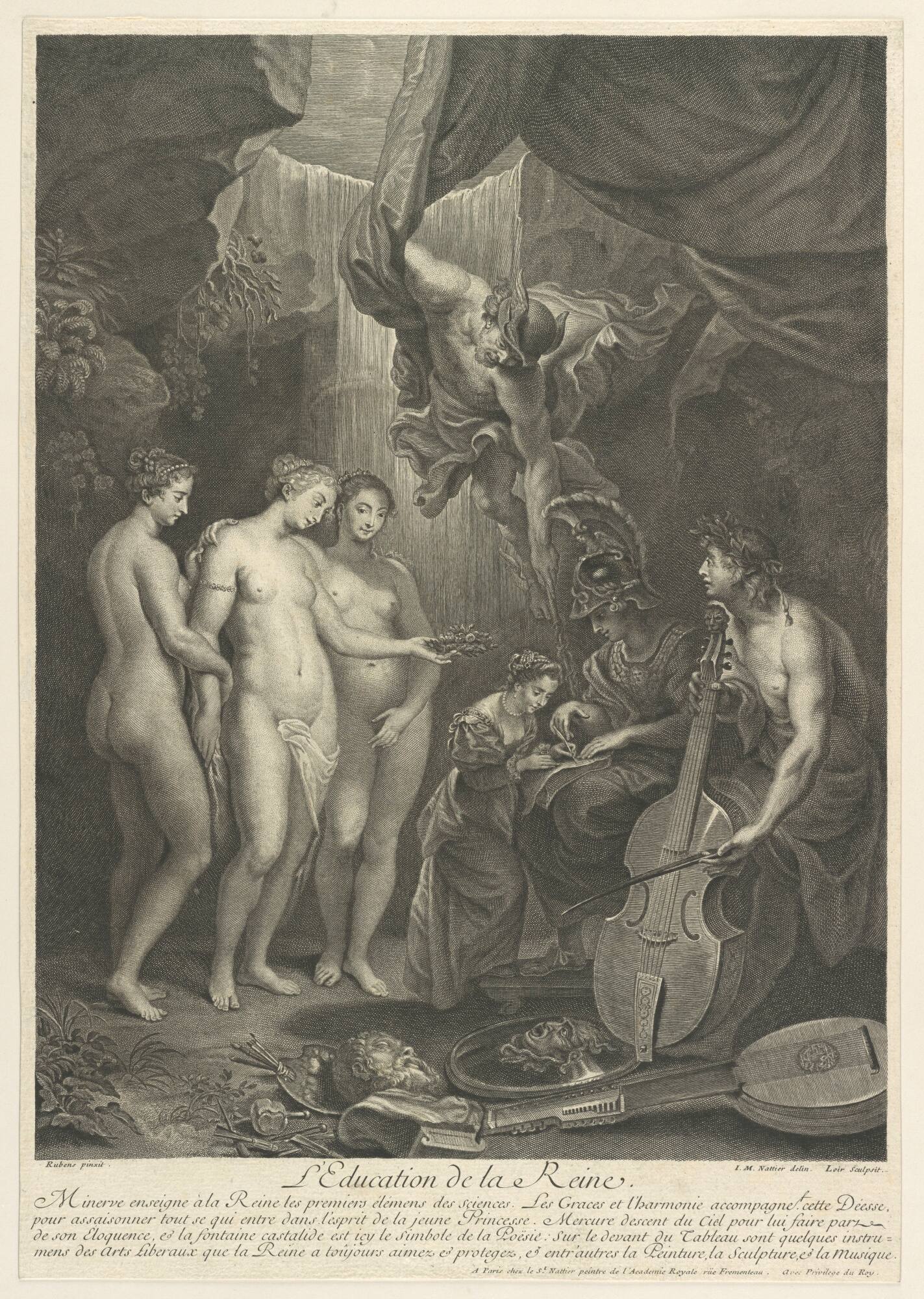 Minerve enseigne à la Reine les premiers élémens des sciences. Les Graces et l'harmonie accompagne.t cette Déesse, / pour assaisonner tout se qui entre dans l'esprit de la jeune Princesse. Mercure descent du Ciel pour lui faire par / de son Eloquence, & la fontaine castalide est icy le simbole de la Poёsie : Sur le devant du Tableau sont quelques instru = / mens des Arts Liberaux que la Reine a toûjours aimez & protegez, & entr'autres la Peinture, la Sculpture, & la Musique.