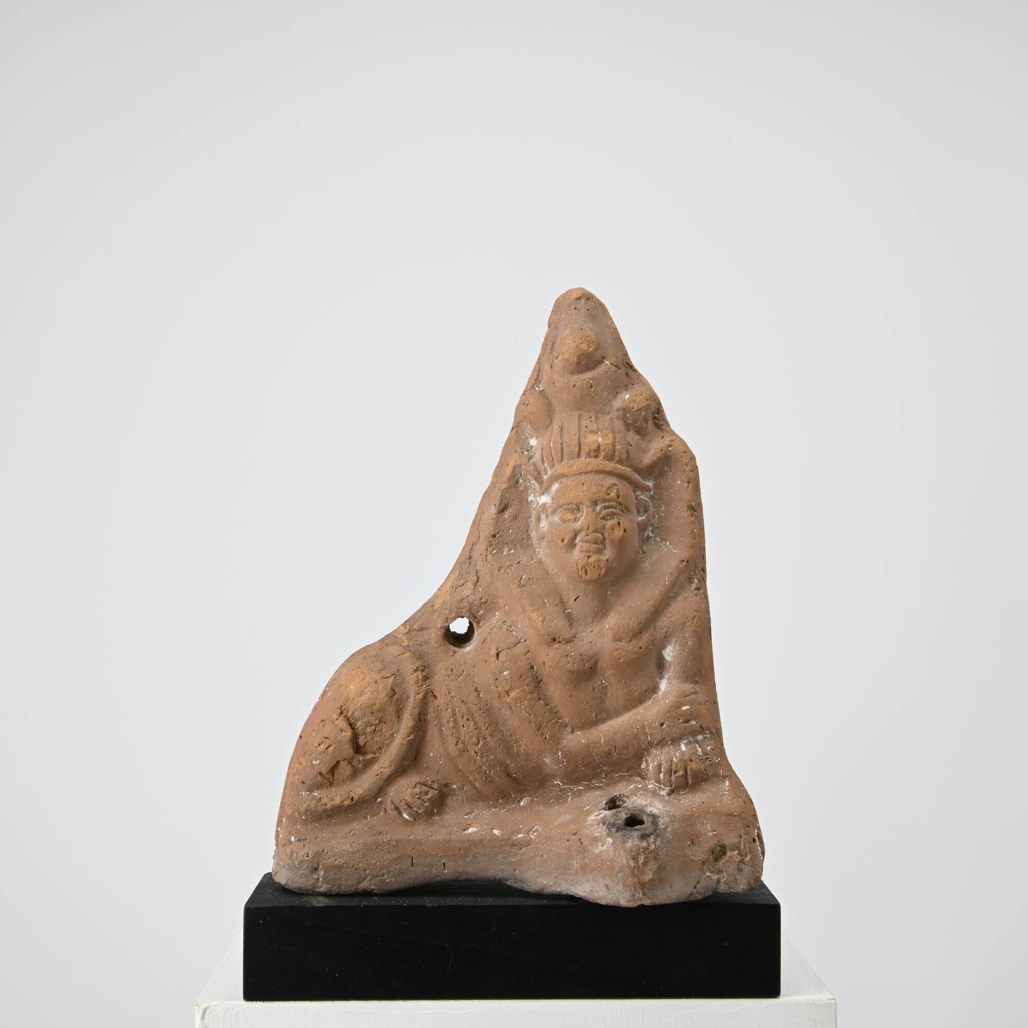 DescriptionÜber einer Basis mit Lampenschnauze liegt eine Sphinx mit aufgerichtetem männlichen Oberkörper im Halbprofil, dem Betrachter zugewandt. Die menschlichen Arme mit Löwentatzen sind übereinandergelegt, der Kopf mit dick aufgeplustertem Gesicht ist von der Königshaube bedeckt, deren Enden sich über die Schultern breiten; darüber erheben sich Doppelknospen und Doppelkrone. Der Löwenunterleib ist auffällig kurz proportioniert, der Bauch ist zu mehreren schematischen Falten zusammengeschoben. Der Schwanz ist über die Flanken hochgeschlagen.DimensionsH 14,9 cm; (L Bas) 11,7; T 5,1