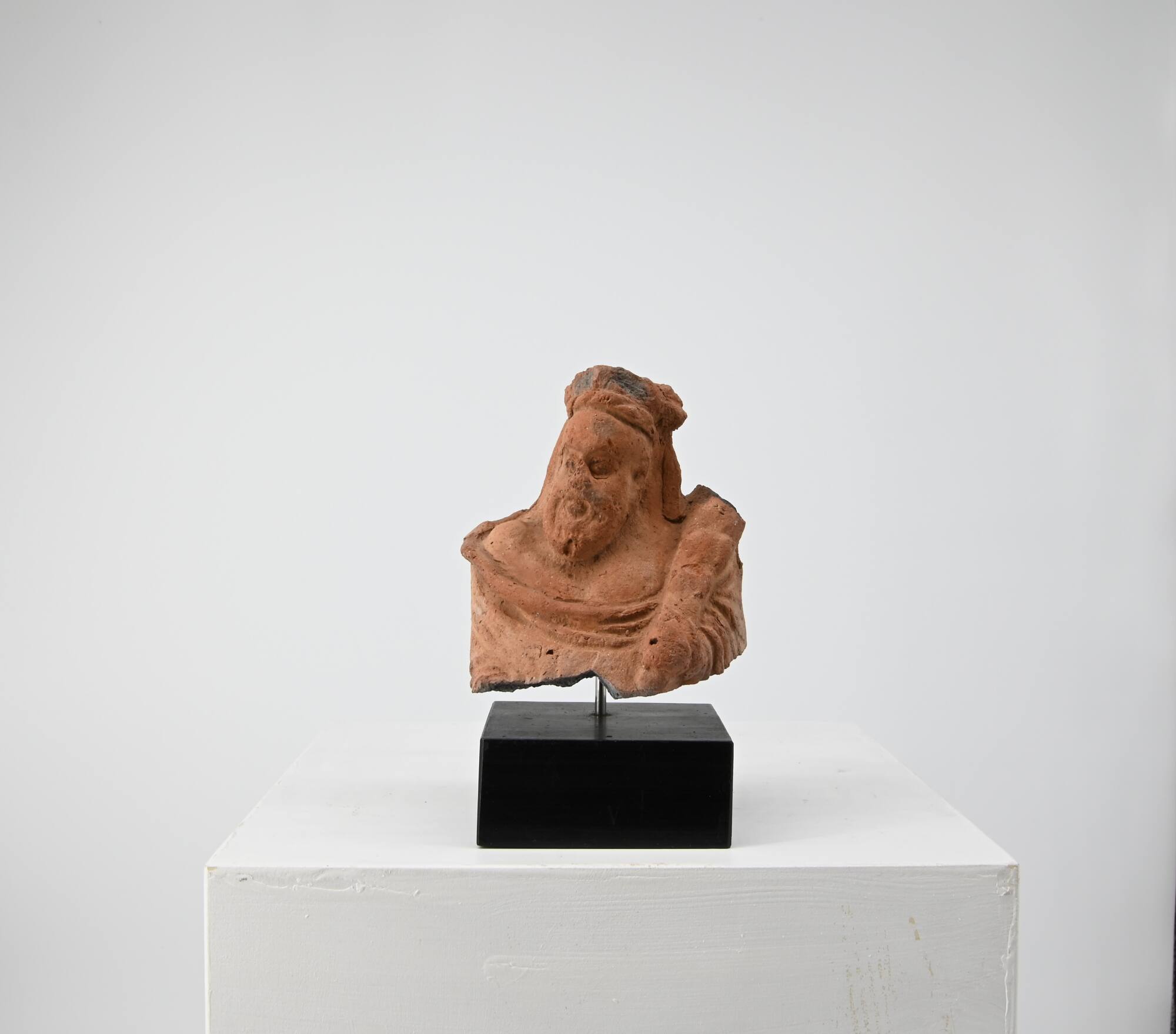 DescriptionVermutlich von einer Herme. Herakles trägt einen eng anliegenden Mantel, der den rechten Arm einhüllt. An der offenen linken Seite ist das in Falten zusammengeschobene Tuch um den Arm geschlungen, von wo es seitlich hinabhängt. Der obere um die Brust führende Saum ist als abstehende Röhre gestaltet, ansonsten sind die Falten breit und sperrig. Herakles hält in der linken Hand eine gegen die Schulter gelehnte Keule. Sein langer und in der Augenpartie schmaler Kopf wirkt beinahe scheibenartig. Er ist stark zu seiner rechten gedreht und im Kinn vorgeschoben. Der Bart ist summarisch als Masse angegeben, die eng stehenden, maskenartig umrandeten Augen sind riesig. Ein Reif, von dem Blätter strahlenartig hochstehen, sitzt auf der hohen Stirn. Extra angesetzte Bindenenden hängen vom Hinterkopf an die Schultern. Der scheibenartige Kopf mit vorgeschobenem Kinn und großen Maskenaugen ist typisch für die spätantike Zeit.DimensionsH 8,8 cm, B 7,4 cm, T 5,4 cm