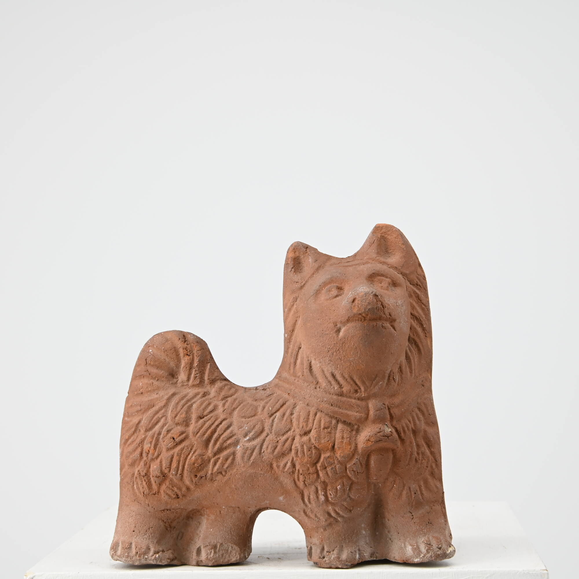 DescriptionSpitz im Profil mit Kopf in Vorderansicht. Hier ist das flammende Fell des Hundes wiedergegeben, indem die einzelnen zungenförmigen Haarflocken schraffiert sind. Um den Hals strahlenförmige Haarmähne, darunter eine Bulla an doppeltem Halsband.DimensionsH 10,2; B 10,1; T 4,7