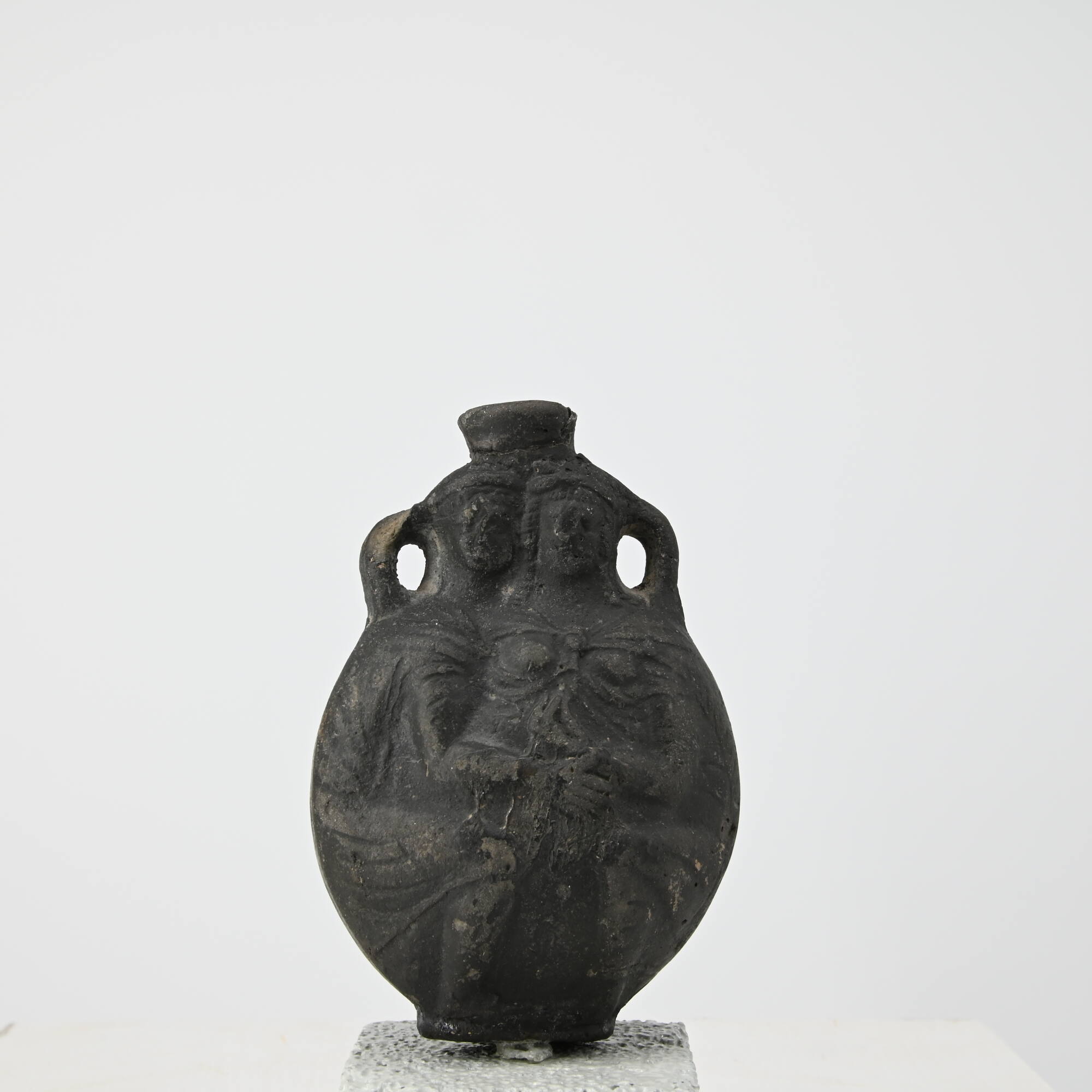 DescriptionAus zwei Formen, beidseitig reliefiert. Henkel und Mündung angesetzt. Ausbruch in der Mitte der RS, Bestossungen an Gesichtern, Armen, Händen. Ton grauschwarz, schwarzglänzend überzogen. Zweihenkelige Feldflasche mit ovoiden Körper, auf dem zwei symmetrisch kauernde, sich umarmende Figuren, in Relief wiedergegeben sind. Ihre Köpfe, die beinahe rundplastisch modelliert sind, bilden den Gefäßhals. Die männliche Gestalt in Chlamys mit vorgesetzten rechten Fuß ist bis auf den Kopf ganz in profilansicht dargestellt. Das Gesicht ist kastig und breit angelegt, über den kurzen, in den Stirn fallenden Haarsträhnen, liegt eine Binde. Mit der rechten Hand greift die männliche Figur nach dem Handgelenk der Frau, die ihren Oberkörper frontal herausgedreht hat. Sie ist mit dem zwischen den Brüsten verknoteten Isisgewand bekleidet, dessen ausgefranster Saum seitlich geradlinieg herabhängt. Mit langen, spitzen Fingern ist sie offenbar gerade im Begriff, den Knoten zu lösen. Ihr rundlich - ovales Gesicht wird von Korkenzieherlocken umgeben, die Stirn gleichfalls von einer Binde umzogen. In der Rückenansicht umarmen sich die beiden Figuren von Schulter zu Schulter; ihre aneinander gelehnten Köpfe sind von einer kurzen, kanellierten Säule, mit ionischen Kapitell überschnitten. Insgesamt ist die Modellierung deutlich und holzschnittartig ausgeführt.DimensionsH 9,0 cm B 6,3 cm T 4,4 cm