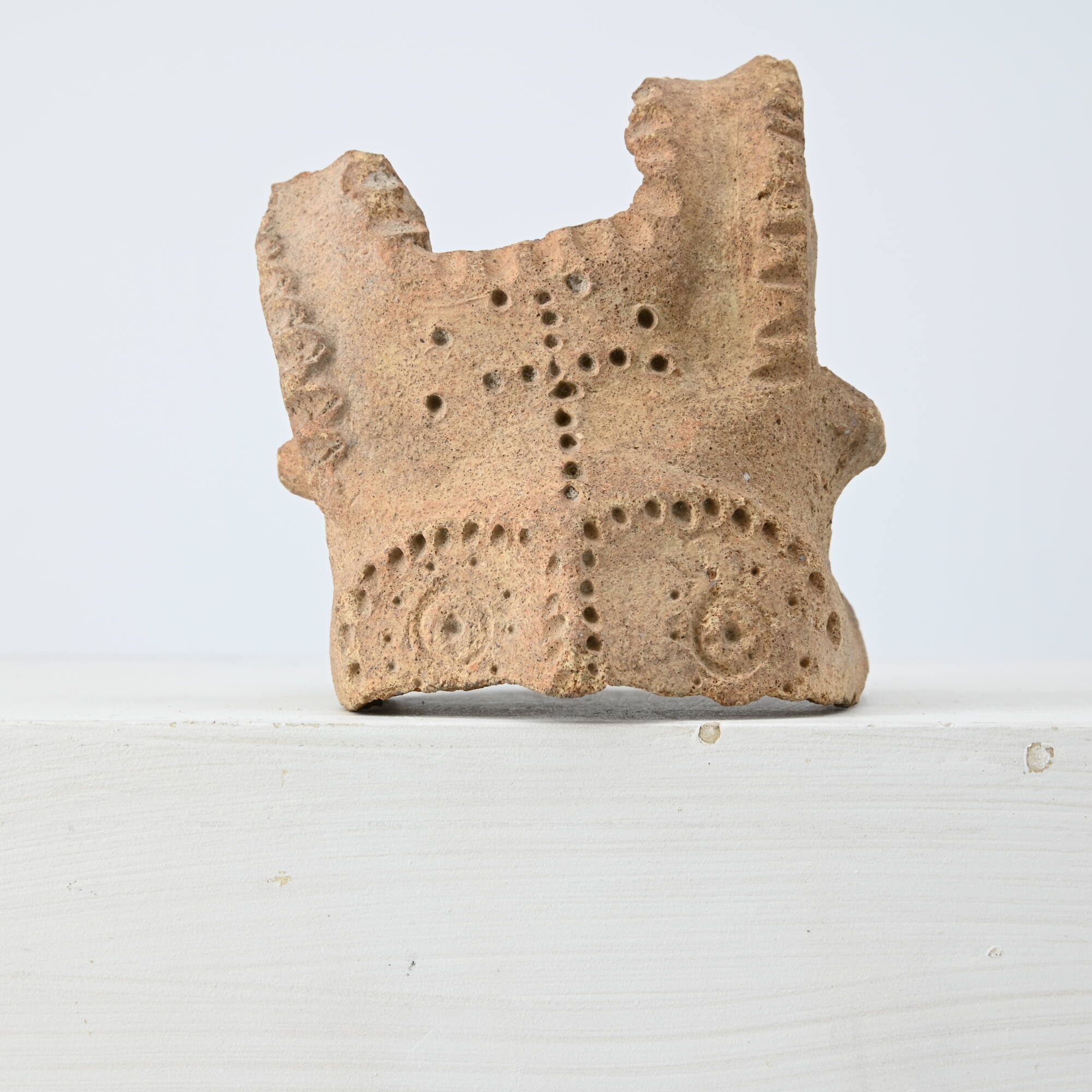 DescriptionKopf eines Ziegenbocks (?) aus braunem Ton mit gelbem Überzug. Nase und Augen sind punktiert.DimensionsH 9,0 cm