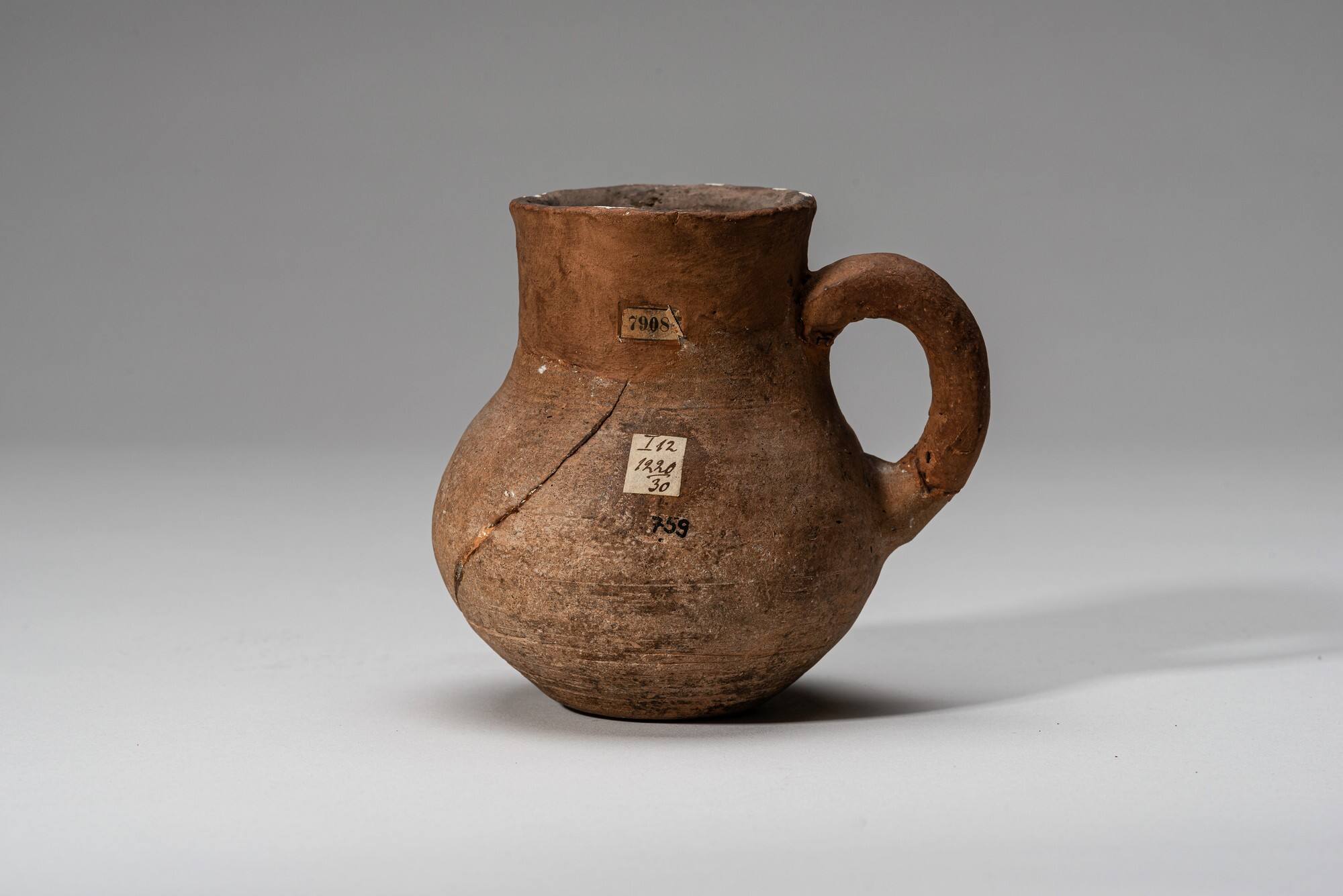 DescriptionEinhenkliger Becher mit kugeligem Unterteil und leich konkav ausschwingendem Halsfeld.Object numberKLA-Or-759