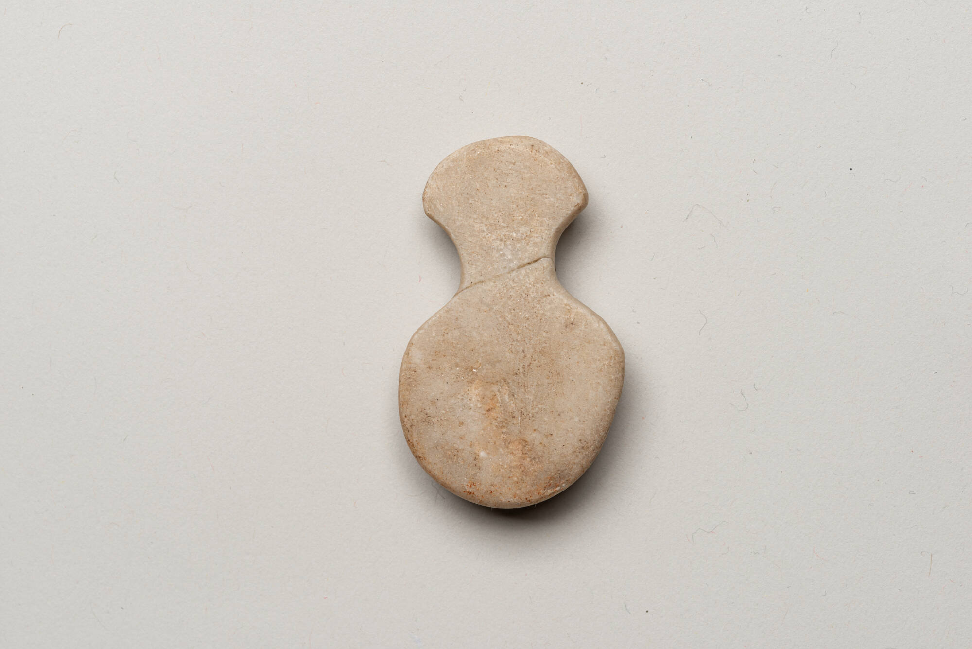 DescriptionDieses sogenannte Idol aus Marmor verfügt über eine typische achtförmige Gestalt und wird den abstrakten Idolen zugeschlagen. Im Gegensatz zu anderen Idoltypen und Figurinen, bei welchen Details wie Gesichtszüge, Kleidung oder Schmuck markiert wurden, erscheinen diese sehr schlicht. Obwohl schematisch geformt, zeigt sich der untere Teil größer und rundlicher als der obere, suggeriert also eine Unterscheidung von Körper- und Kopfteil. Bei einigen sehr ähnlichen acht-förmigen Idolen sind im oberen Teil Augen und Augenbrauen eingeritzt, die eindeutig darauf hinweisen, dass es sich auch bei den vermeintlich abstrakten Exemplaren um schematische Menschendarstellungen handelt. Solche Objekte mit Augen werden als „Eulen-“ oder „Augentyp“ bezeichnet.