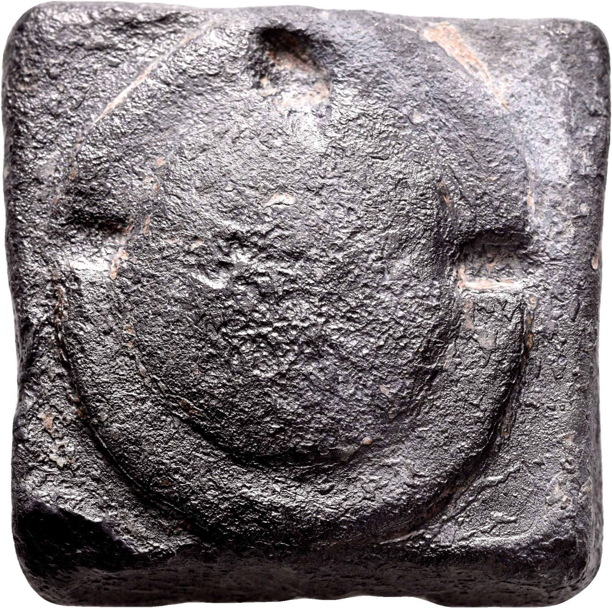 DescriptionAnnährend quadratisch, obenauf in Hochrelief ein böotischer Rundschild mit 4-fach ausgeschnitten Rand. Nach Konrad Hitzl handelt es sich um einen attischen Viertelstater eines klassischen, vielleicht auf Solon zurückgehenden Gewichtsfußes von ideal 229,21g. Der Stater war die geläufigste attische Gewichtseinheit und entsprach zwei Minen - ist aber von der gleichnamigen Münze (die zwei Drachmen entsprach) zu unterscheiden.DimensionsGew. 227,15 g