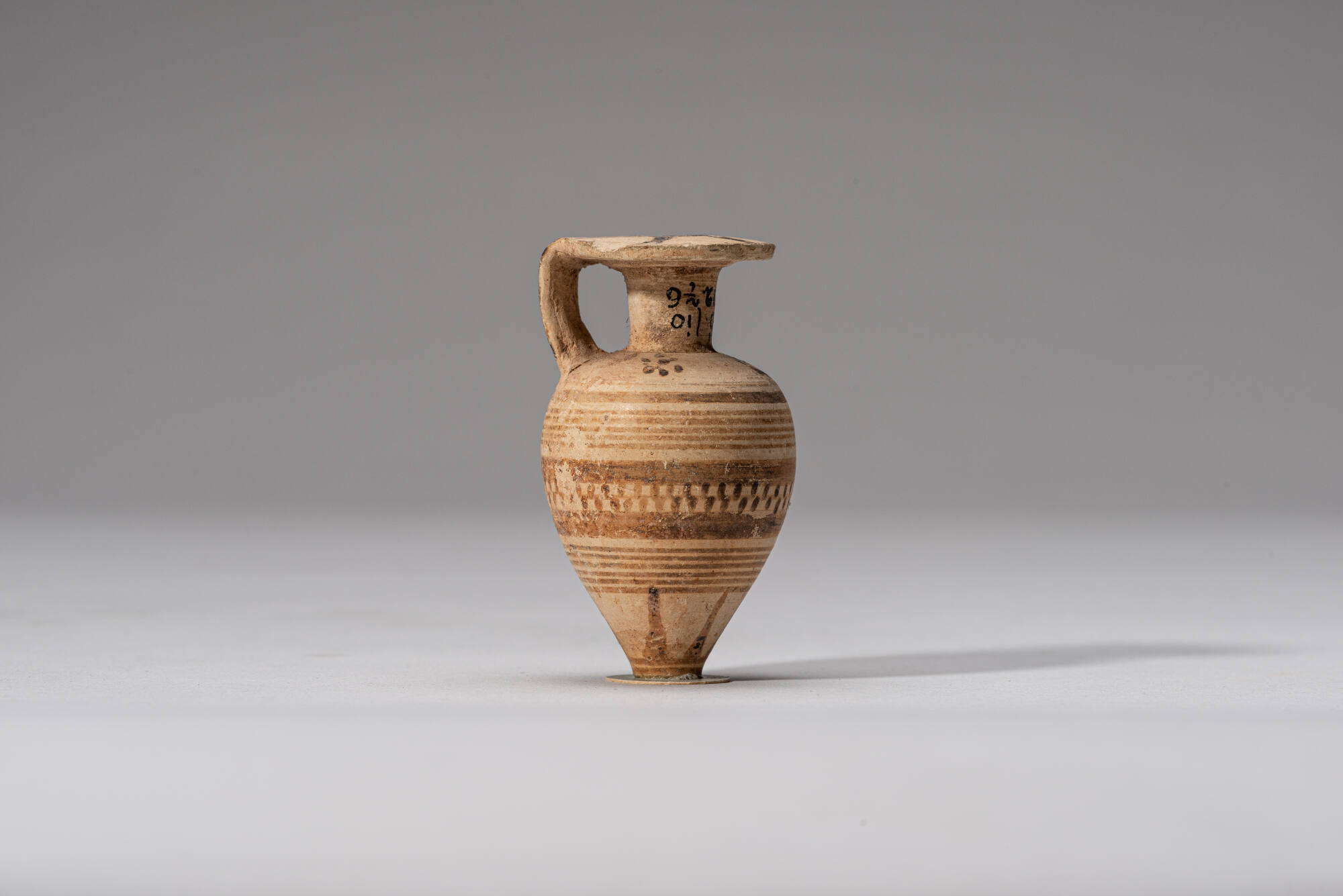 DescriptionDoppelte Punktreihe zwischen zwei breiten Firnisbändern, gerahmt von Bündeln schmaler Streifen. Am Fuß züchtig gezeichneter, langgestreckter Strahlenkranz über zwei Ringen. Auf der Schulter ein weiterer Ring und flüchtig gezeichnete Punktrosetten. Henkel mit Wellenlinie zwischen vertikalen Streifen. Auf dem Mündungsteller Strahlenkranz, ausgehend von einem Ring um die Mündungsöffnung.DimensionsH 6,9 cm