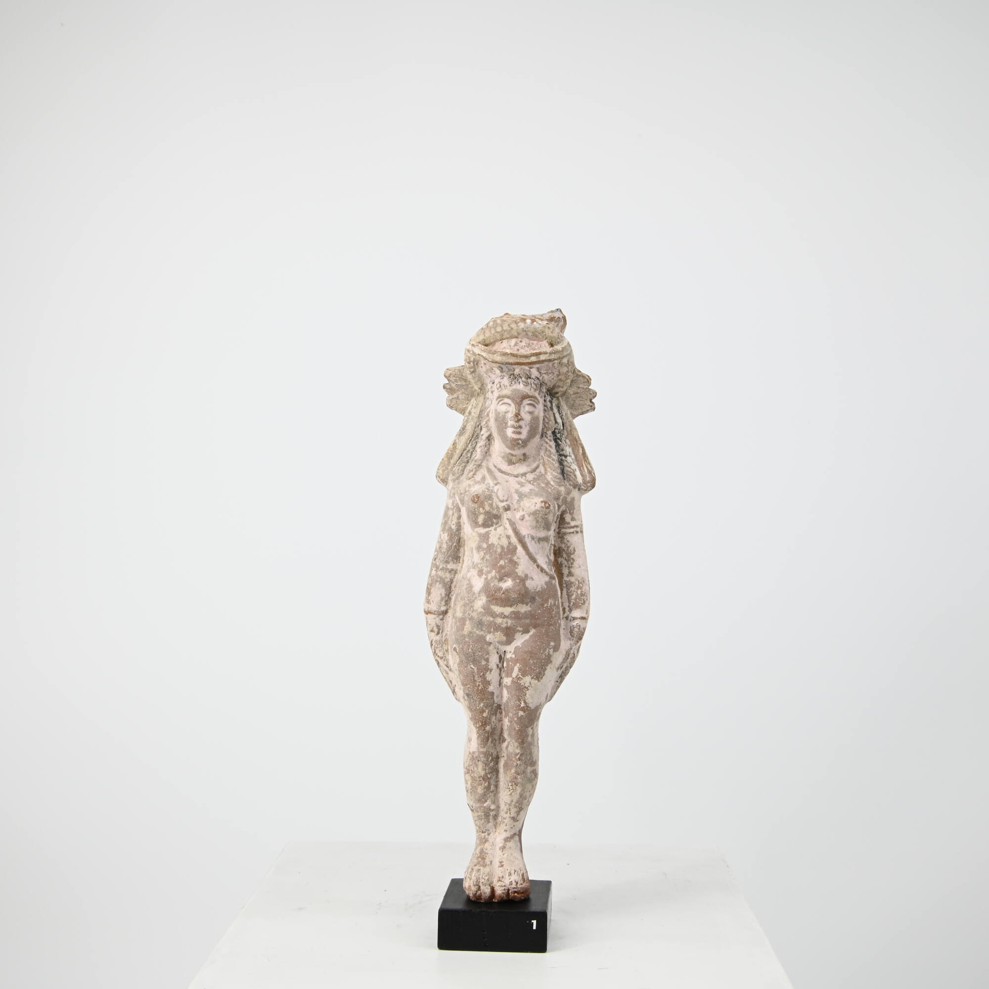 Description'Nackte Göttin' mit an die Oberschenkel gelegten Händen im geschlossenen Stand. Ihre Beine sind relativ kurz, an den Oberschenkeln schwingt die Figur stark aus. Die Taille ist breit und wenig eingezogen. Das Inkarnat wirkt weich und ein wenigschwammig, die Brüste mit aufgesetzten Brustwarzen sind klein. Das längliche Gesicht mit weit geöffneten Augen und kleinem herzförmigem Mund scheint recht schlaff. Die Frisur aus Korkenzieherlocken - an der Stirn kurz, seitlich in zwei Stufen und hinten gerade bis über die Schultern hinabfallend - wird von einem aufwendigen Kopfputz überlagert. Über einem dicken, recht hohen, gepunkteten Kranz, ist ein schmälerer mit einer flachen Binde befestigt, darüber erhebt sich ein nun abgebrochener Kalathos. An den Seiten stehen spitz gezackte Blätter ab, Bindenenden säumen geradlinig die auf die Schultern reichenden Locken. Ringe am Hals, an den Hand- und Fußgelenken, am rechten Unter- und linken Oberarm schmücken den Körper. Ein den Oberkörper kreuzender Gurt, der über der rechten Brust verschlossen ist, erinnert an Darstellungen von Aphrodite. An den Füßen trägt die Figur hohe Sandalen. Der Typ mit reichem Kopfputz aus Kränzen und Blättern vermutlich ab dem 2. Jh. v. Chr. (s. Adriani).