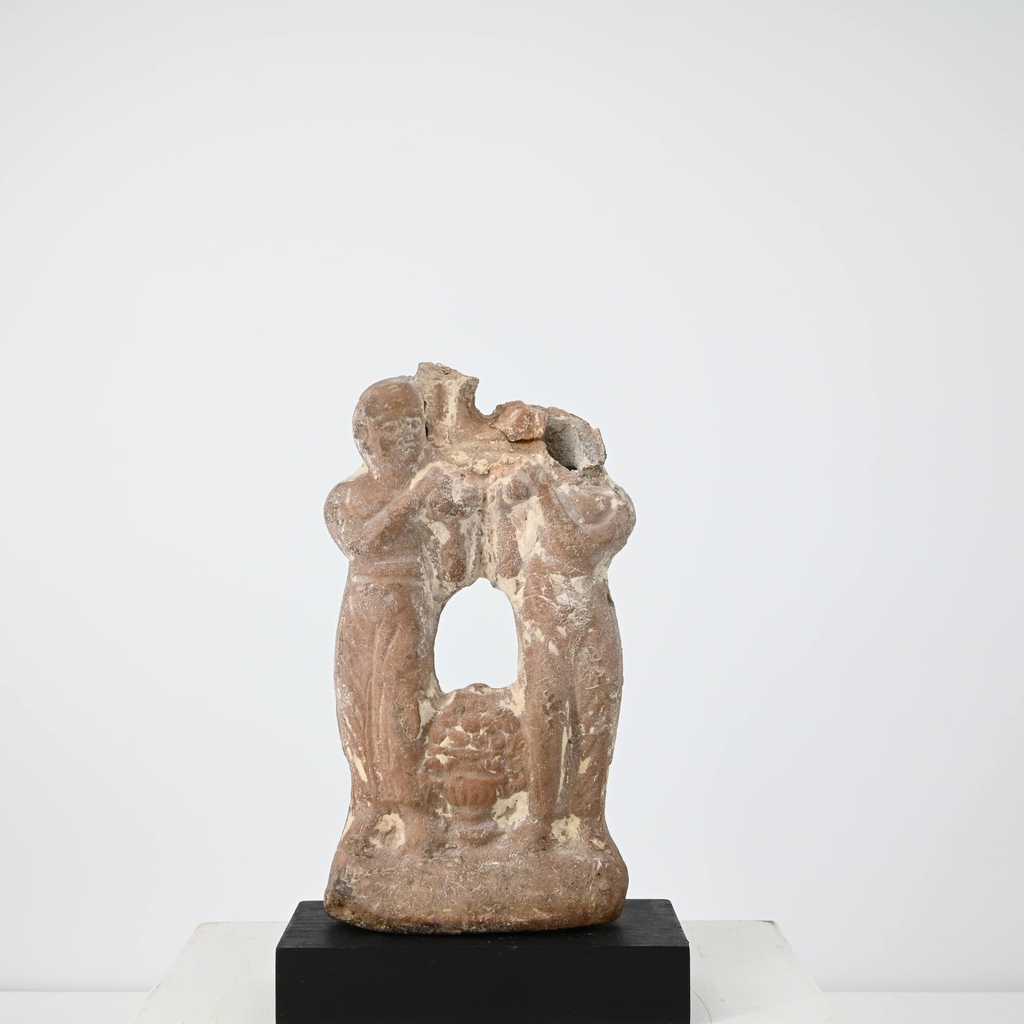 DescriptionAuf 2 cm hoher, geradliniger Basis stehen zwei Priester mit geschwungenen Hüften, die gemeinsam ein Kultbild auf ihren Schultern tragen. Sie sind jeweils mit einem knöchellangen Schurz bekleidet, der in wenigen, schematisch eingeritzen Falten zwischen die Beine fällt und im übrigen eng, wie naß anliegt: Der Nabel darunter ist sichtbar, das Spielbein drückt sich deutlich durch. Im freien Raum zwischen den Dienern steht eine gerippte Schale mit Standfuß und seitlichen Henkeln, die üppig mit Früchten gefüllt ist. Mit beiden Armen stützen die beiden Priester ein Kultbild, das leider weggebrochen ist. Eine ballonförmige Gipsergänzung, aus der eine tönerne röhrenförmige Spitze ragte, wurde entfernt. Ihre Köpfe, einer ist noch erhalten, sind rund und kahl bis auf eine seitliche Jugendlocke.DimensionsH 17,0 cm; B 8,8 cm; T 3,6 cm