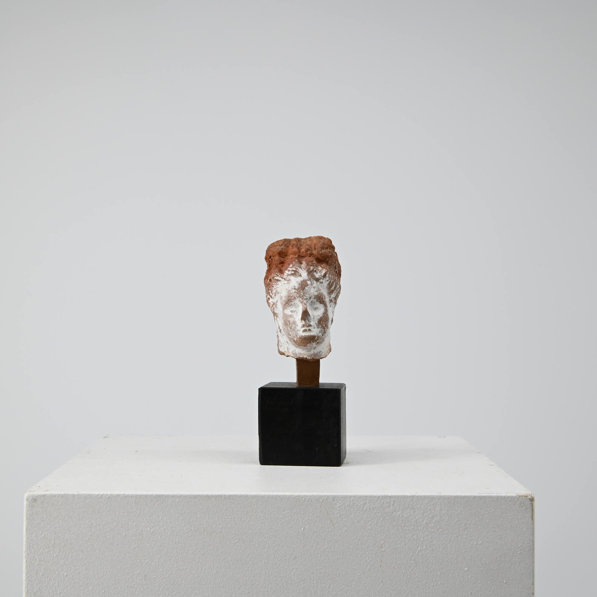 DescriptionLänglich-ovales Köpfchen mit rundem Kinn und großen Wangenflächen. Die plastischen, schräg schraffierten Stränge der Melonenfrisur sind auf dem Scheitel zu einer breit ausgedehnten Schleife zusammengebunden. Kleine scheibenförmige Ohrringe.DimensionsH 4,4 cm; B 2,7 cm; T 2,9 cm