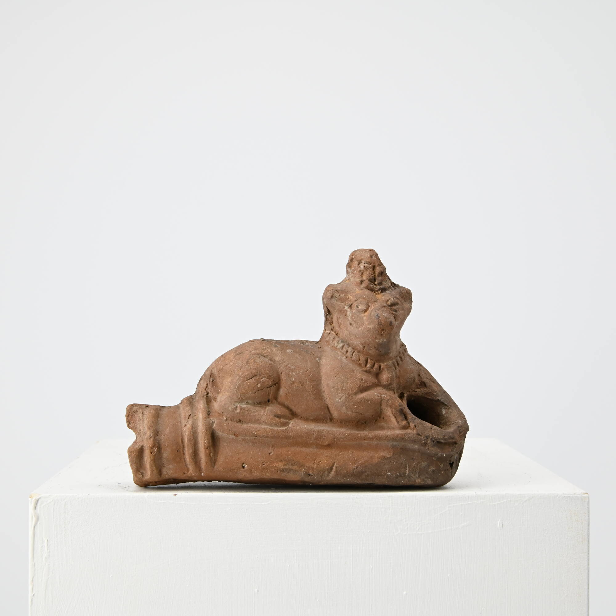 DescriptionAuf einer Räucherpfanne mit wannenförmigem Körper und tüllenförmigem Griffansatz liegt eine Katze in Dreiviertelansicht, die Vorderpfoten um die runde Räucheröffnung geschlungen. Den Hals des Tieres schmückt eine Gliederkette mit rundem Anhänger, zwischen den spitz abstehenden Ohren ragt über der Stirn eine Federkrone hoch.DimensionsH 6,4 B 9,6 T 4,5