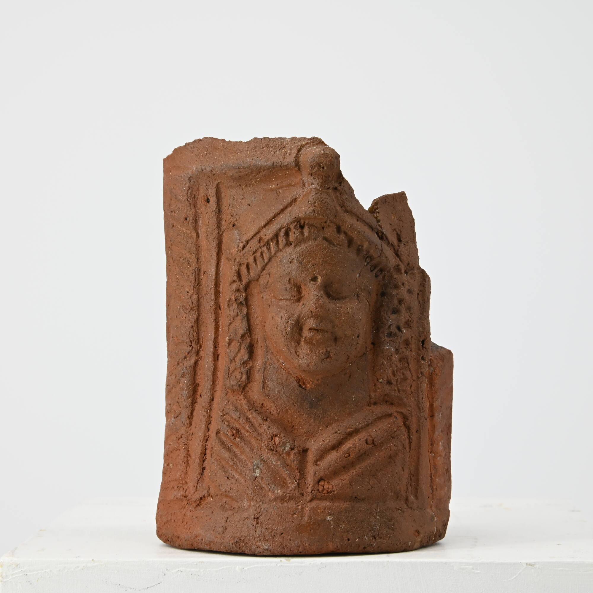 DescriptionLichthaus mit flacher Basis, die Fackeln wie Halbsäulen in den Gerätkörper integriert. In dem breiten Bildfeld ist die Büste einer Athena dargestellt: Das Gewand ist durch einfache zu einer Mittellinie laufende Schraffur gegliedert, das kantige Gesicht großflächig modelliert. Die Haare sind in der Art eines Zahnschnittmusters angegeben, darüber sitzt ein dreieckiger Helm mit hochragendem Mittelemblem und seitlichen Büschen. Recht krude, schematische Arbeit.DimensionsH 10,1; B 7,4; T 6,3