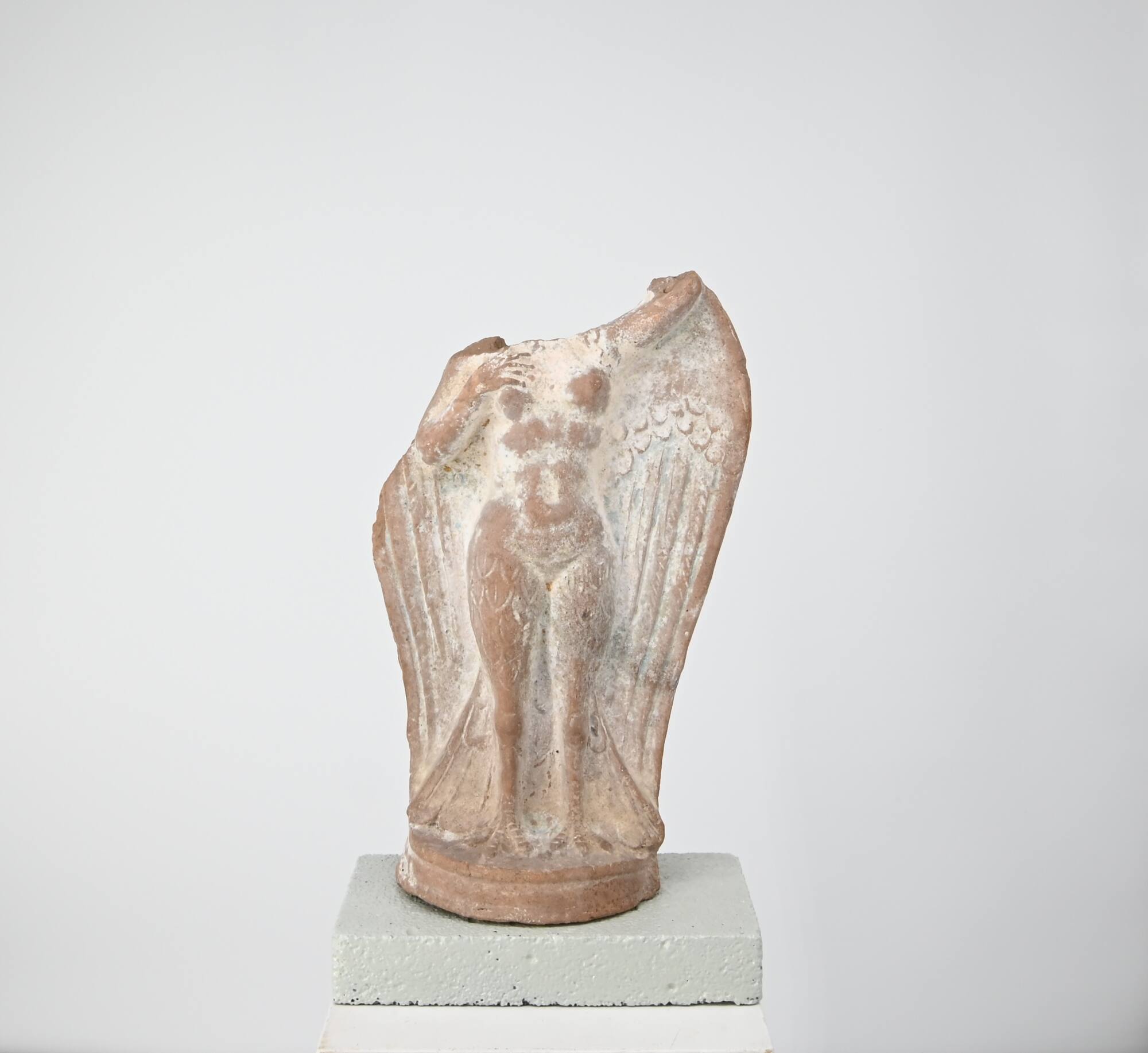 DescriptionAuf flach-ovaler profilierter Basis stehende Sirene mit ursprünglich an den Kopf erhobener linker Hand, die rechte Hand auf der Brust liegend. Ihre Beine auf dünnen Vogelklauen werden an den Oberschenkeln breit, kurze Deckfedern sind eingeritzt. Der weibliche Oberkörper der Sirene ist nackt mit kleinen festen Brüsten, die Oberfläche ist weich und verschwommen. Aus den Schultern wachsende große Flügel flankieren die Seiten bis auf die Basis. Auch in diese hellblau bemalten Flügel sind die Federn eingeritzt.DimensionsH 23,5 cm; B 10,0 cm; T 6,5 cm