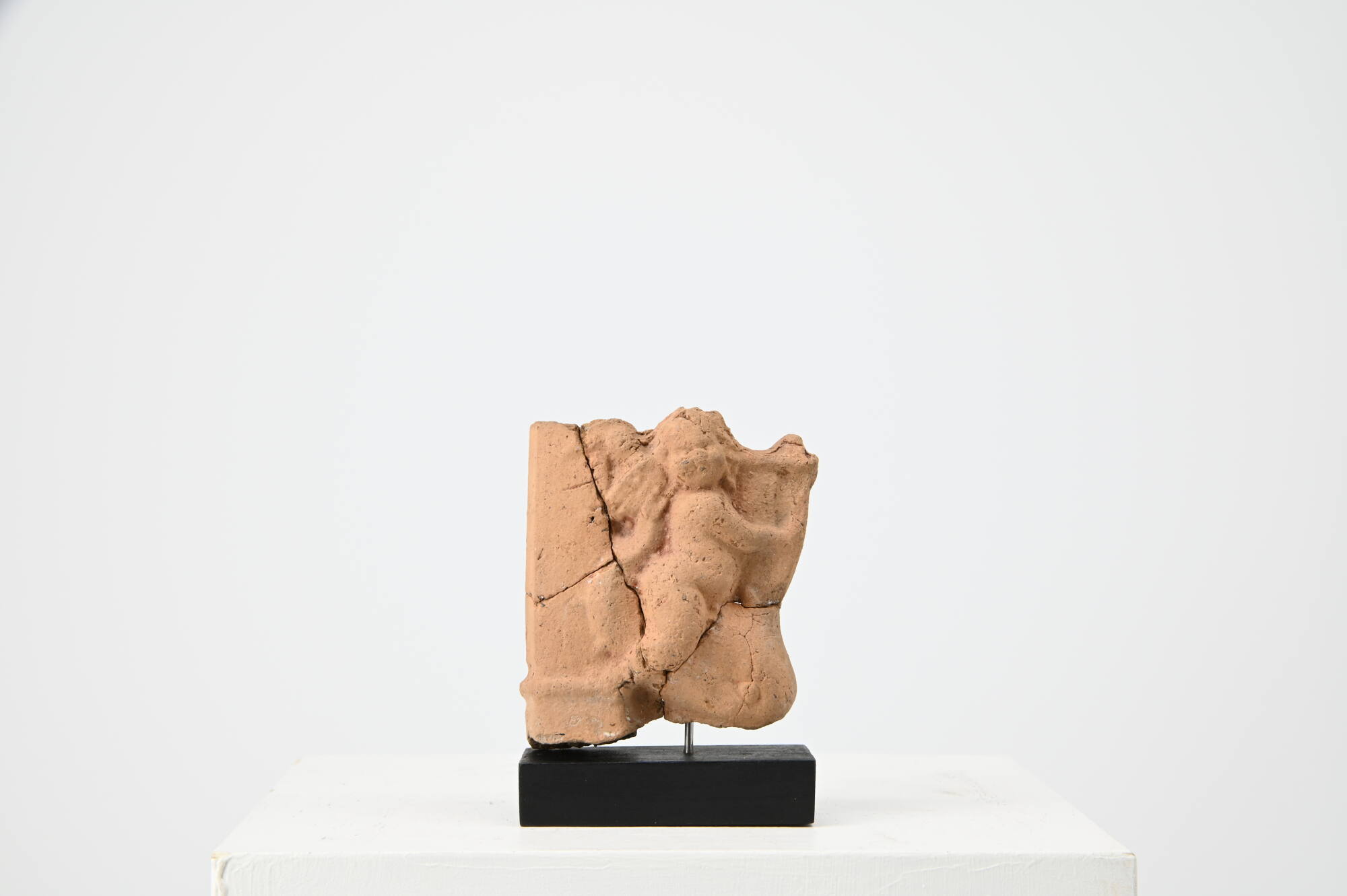 DescriptionGerät, vermutlich Traglampe, mit Darstellung eines nach rechts gerichteten Delphins, auf dem ein babyhafter nackter Eros reitet. In den vorgestreckten Armen hält er eine Leier. Sein pausbäckiger runder Kopf ist beinahe frontal nach außen gewandt. Die nicht gut erkennbaren längeren Haare fallen seitlich bis auf die linke Schulter. Zwei kleine Flügel überschneiden einen breiten Pfeiler im Rücken des Gottes, der auf einer profilierten Basis steht.DimensionsH 5,7 cm; B 5,1 cm; T 2,3 cm