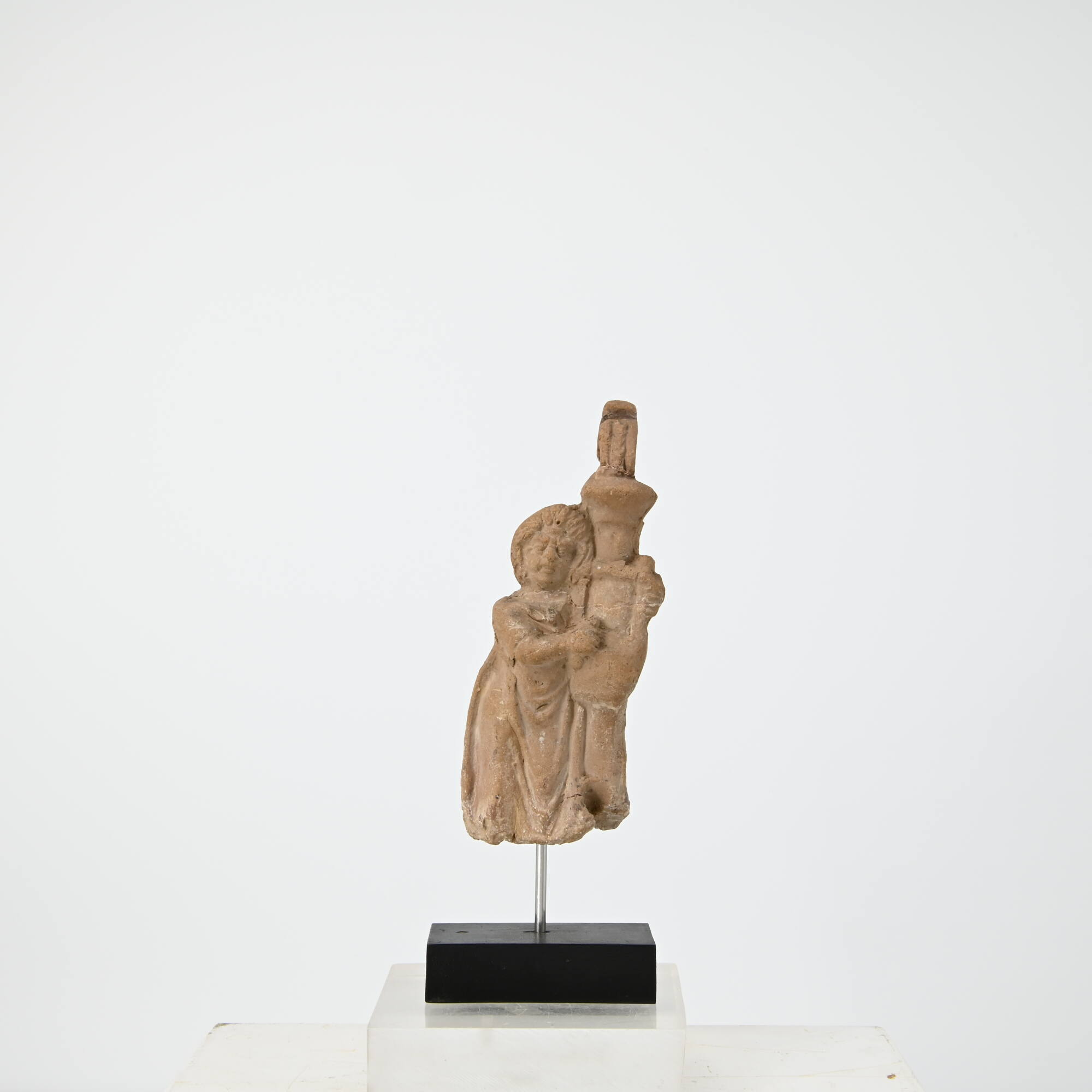DescriptionStatuette eines neben dem hohen Griff einer Traglampe mit runder Handhabe stehenden Mannes im langen kurzärmligen Gewand, der in seinem linken Arm vor den Lampengriff eine Lyra hält. Die Finger der linken Hand umfassen den äußeren Rahmen des Instruments, mit der rechten Hand schlägt er das Plektron. Der Blick des Musikers ist wild: Die großen Augen ruhen unter wuchtigen Brauenbögen, über der stark gebogenen Hakennase stehen steile Falten auf der Stirn. Lange, ungeordnete und steil hochstehende Haare verstärken den Eindruck der Wildheit. Am Hinterkopf sind die Haare zum Dutt zusammengebunden.DimensionsH 11,4 cm; B 4,6 cm; T 2,2 cm