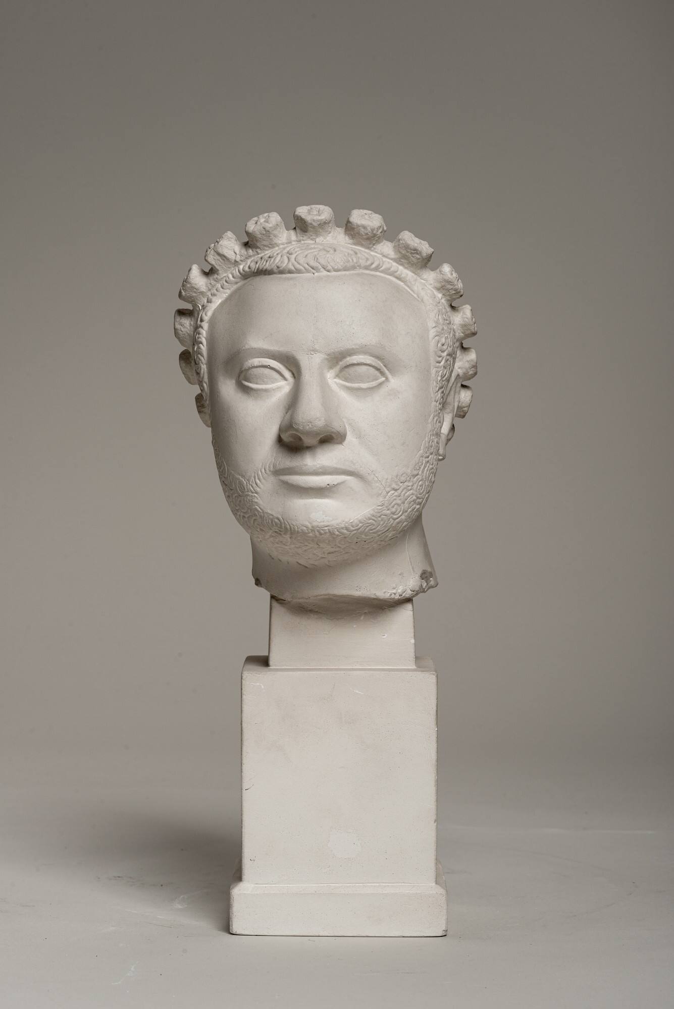Porträtkopf eines Bärtigen mit Rosettendiadem und Rückenpfeiler