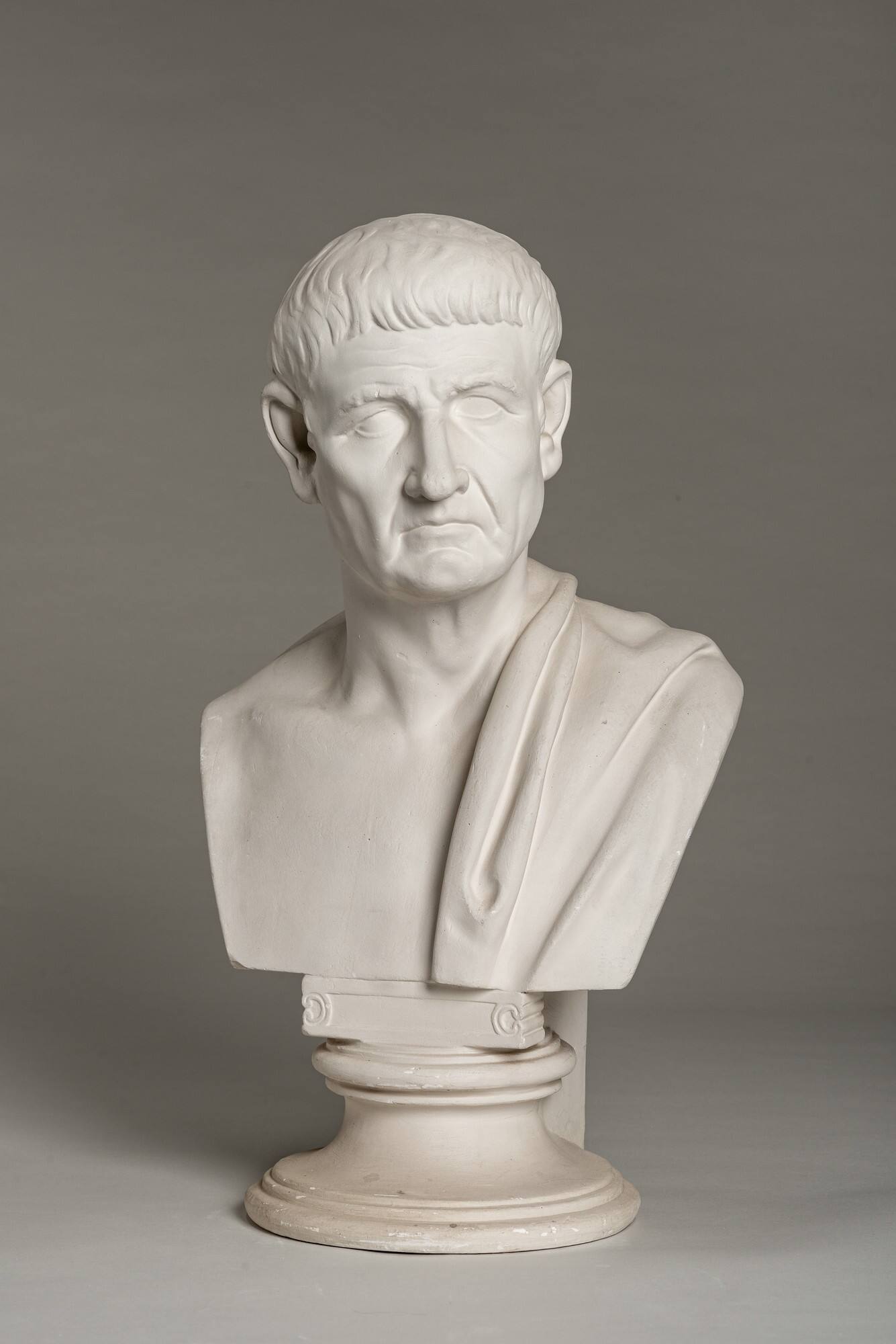 DescriptionDie Vorlage dieses Kopfes sitzt einer berühmten Sitzstatue, wohl eines Philosophen, im Palazzo Spada in Rom auf und wurde daher unter anderem mit Aristoteles identifiziert. Tatsächlich ist der Kopf ein der Statue nicht ursprünglich zugehöriges Privatporträt der frühaugusteischen Zeit.Object numberKLA-Gi-856