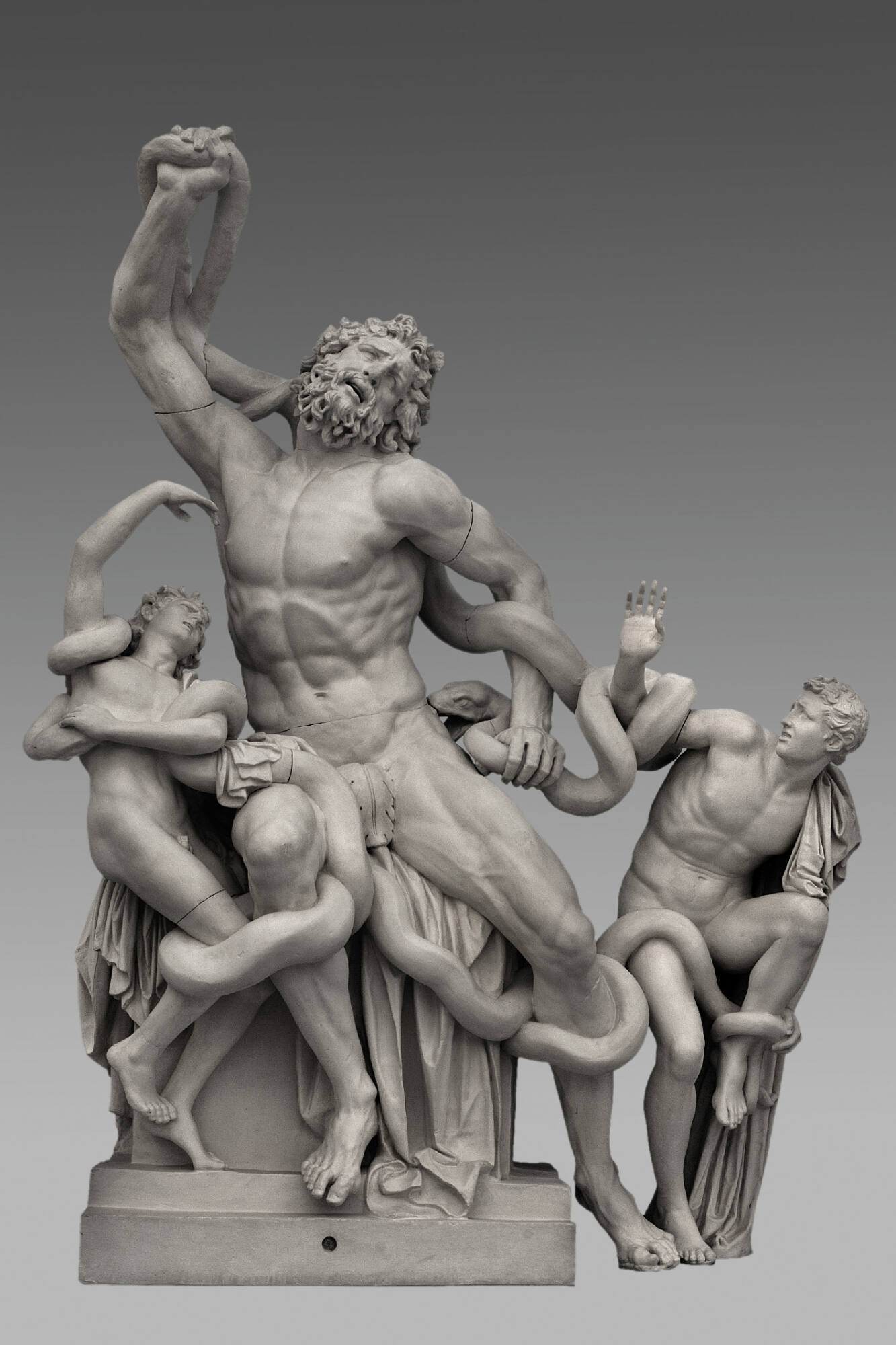 Laokoon, der griechischen Sage nach Priester des Apollon, warnte im griechisch-trojanischen Krieg die Trojaner davor, das hölzerne Pferd in die Stadt zu ziehen. Um ihn zum Schweigen zu bringen, entsandte Athena zwei Schlangen, die ihn und - hier ist sich die Überlieferung uneins - seine beiden Söhne töteten. Der hochgereckte rechte Arm geht auf eine Ergänzung der Renaissance zurück; vier Jahrhunderte nach dem Fund der Statue entdeckte Ludwig Pollak den originalen (angewinkelten) Arm in der Werkstatt eines römischen Steinmetzen.