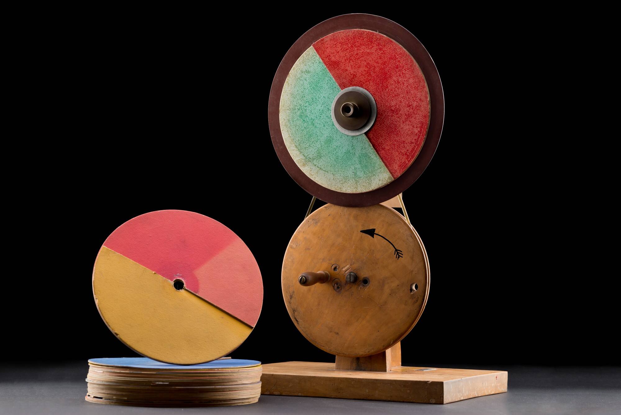 Zur Erforschung und Demonstration von Farbwahrnehmungen wurden in der Physiologie häufig Rotationsapparate und Farbscheiben benutzt. Unser Gerät besteht aus einem Rotationsapparat mit Kurbelrad, Antriebsschnur und Drehscheibe, sowie aus fünf einfarbigen Farbscheiben (rot, gelb, blau, grün, magenta). Weiteres Zubehör sind