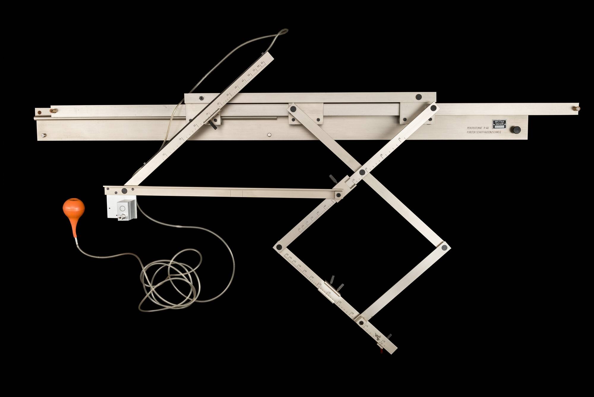 DescriptionPerspektomat mit diversen Schienen, Schiebe- & Rollsystemen mit Gelenken. Daran befestigt: ein Gummi-Pumpball mit Schlauch, der zum Anheben des Zeichenstiftes dient. Wurde zur Perspektivzeichnung verwendet.Zubehör zu Perspektomat: