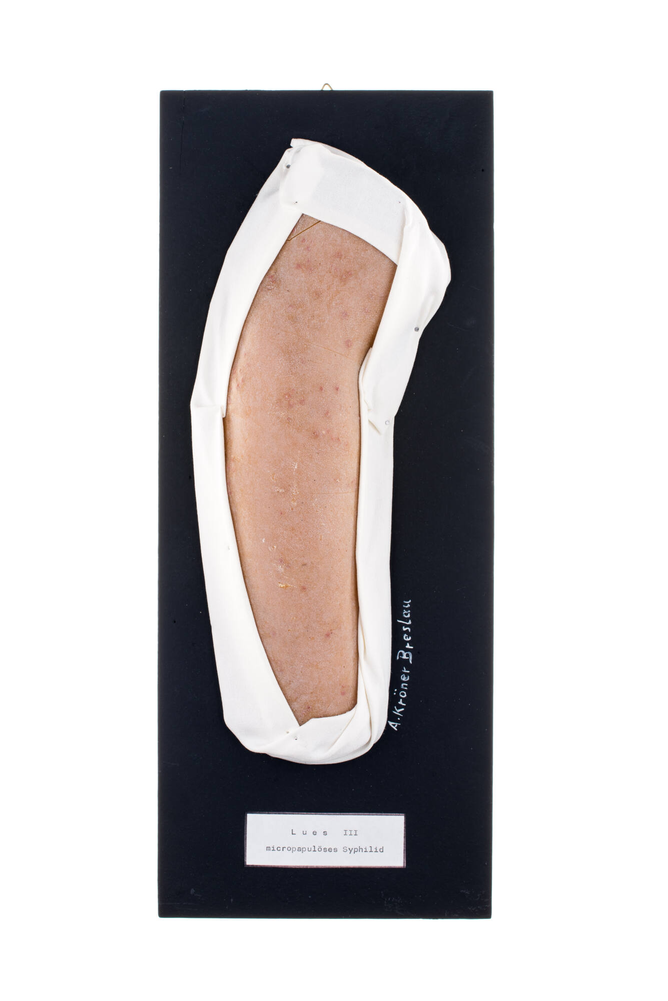 - Lues III (Syphilis, Tertiärstadium) micropapulöses Syphilid am linken Unterarm