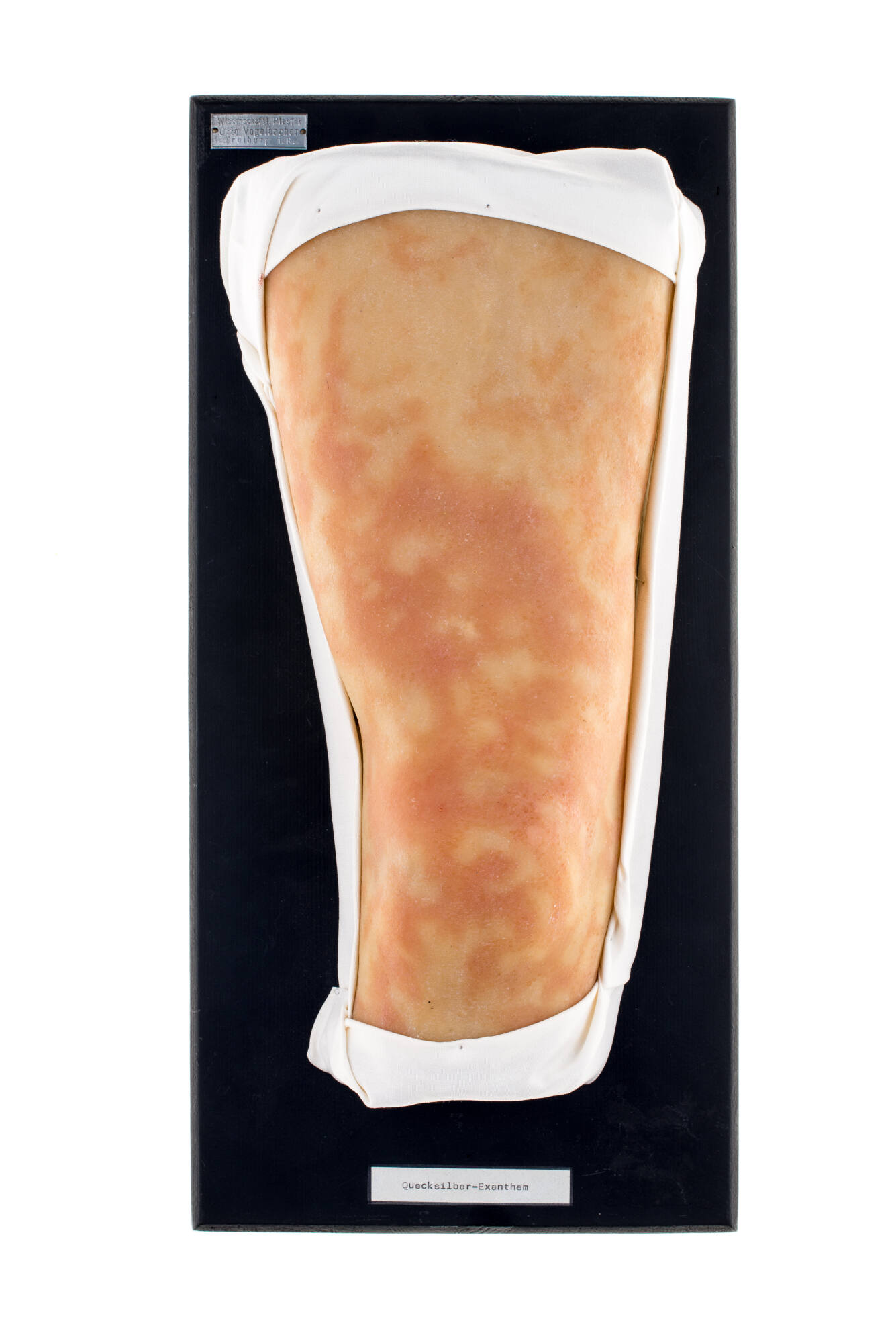 MediumMaterial: Wachs, Kunstoff, Textil, Holzplatte, Metall, Papier Technik: Abformung/Abguss Grundbrett: Holzplatte schwarz bemalt Moulagenkörper: Wachs bemalt/gefärbt Einfassung: Textil mit Metall (Nägel) Diagnoseschild vorne: Papierschild beschriftet mit Schreibmaschine geklebt Etiketten vorne: Metallschild bedruckt aufgenagelt