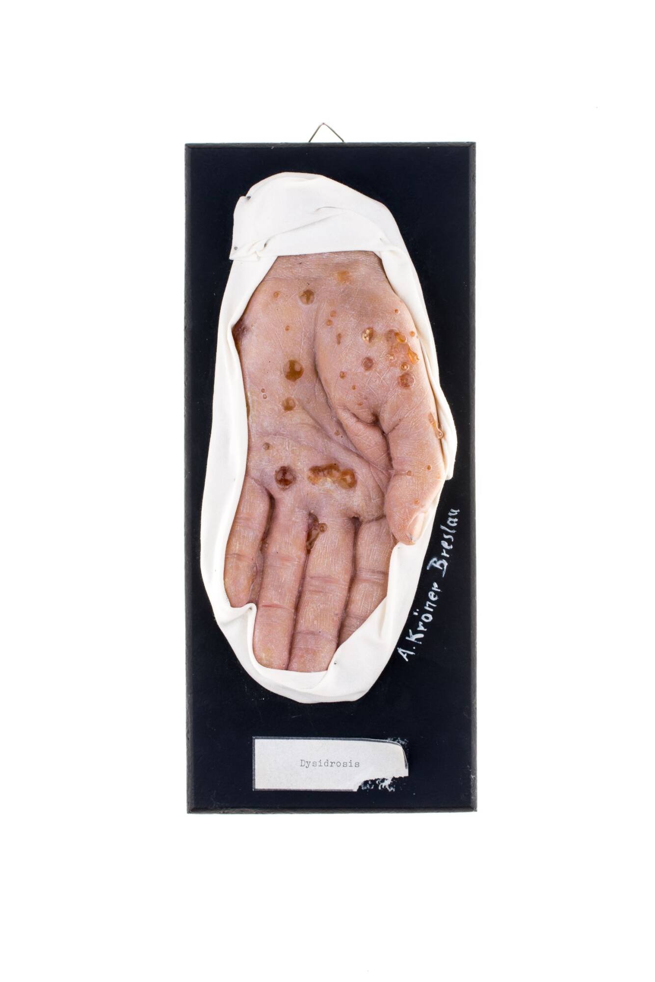 DescriptionHistorischer Patient: Geschlecht unbekannt, Handinnenfläche der linken HandEinzelmodell/Gruppe/Reihe: vermutlich Einzelmodell