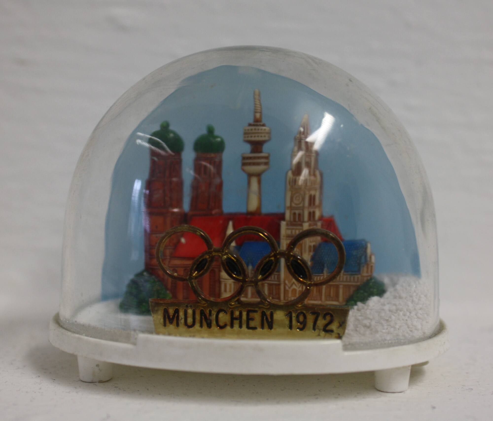 DescriptionElliptische Grundplatte über die sich eine durchsichtige Plastikglocke wölbt. Das Gefäß war wohl mit einer durchsichtigen Flüssigkeit und Kunstschnee gefüllt, der durch Schütteln über die Stadtlandschaft rieselt. Die Flüssigkeit ist inzwischen verdunstet, der künstliche Schnee aber immer noch 'rieselig'. Auf der Grundplatte stehen farbige Modelle der Frauenkirche, des Olympiaturms und des Rathauses. Im Vordergrund stehen goldfarbene Olympiaringe, darunter ein goldenes Plättchen mit der schwarzen Aufschrift "München 1972".Dimensions7 x 5,5 x 6 cm