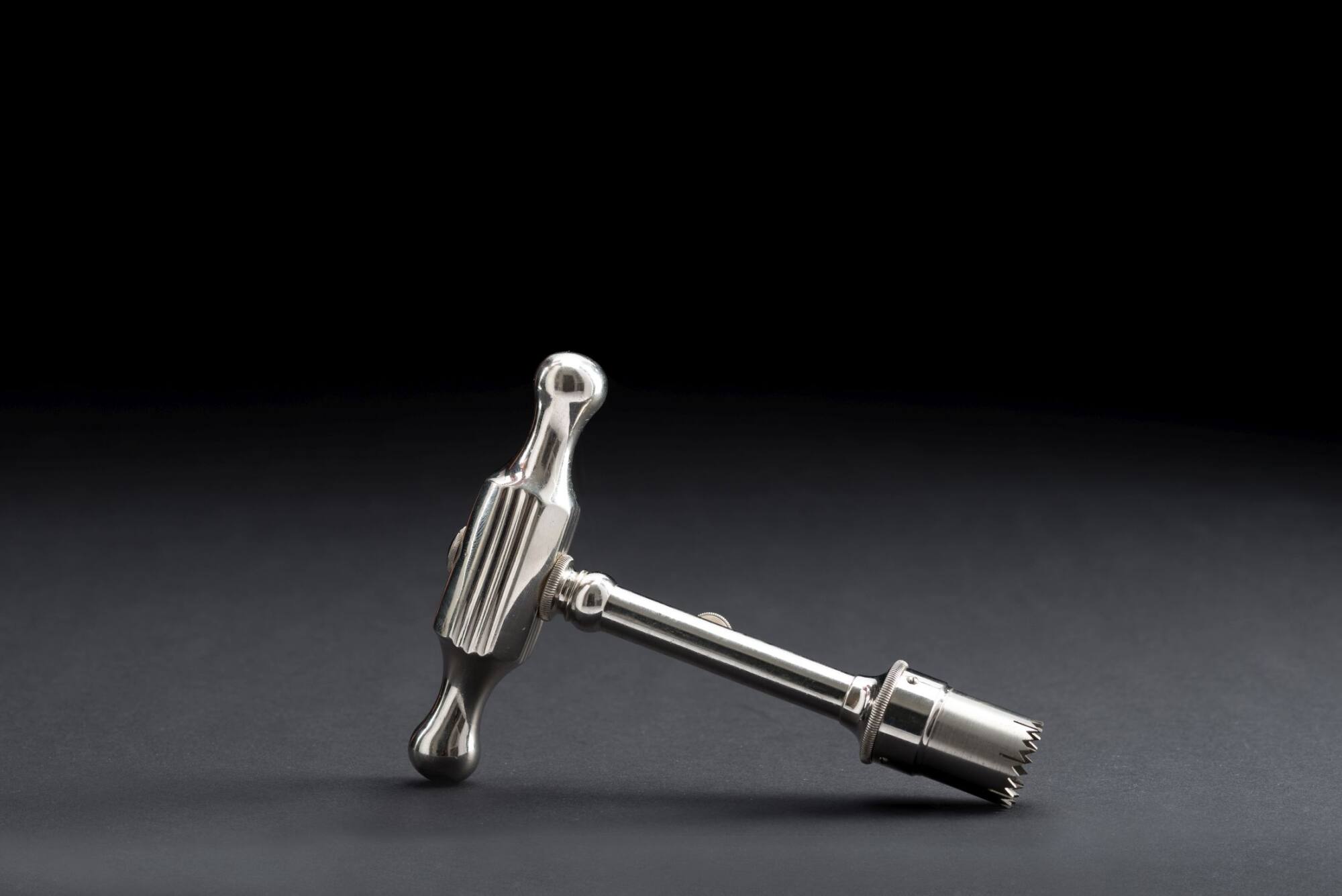 DescriptionBei diesem Objekt handelt es sich um einen Trepanierbohrer. Das chirurgische Besteck dient der Trepanation, also der Öffnung von knöchern umschlossenen Räumen wie dem menschlichen Schädel.Das Instrument ist T-förmig und besitzt am oberen Ende eine Art Griff mit der sich das Gerät festhalten lassen kann.