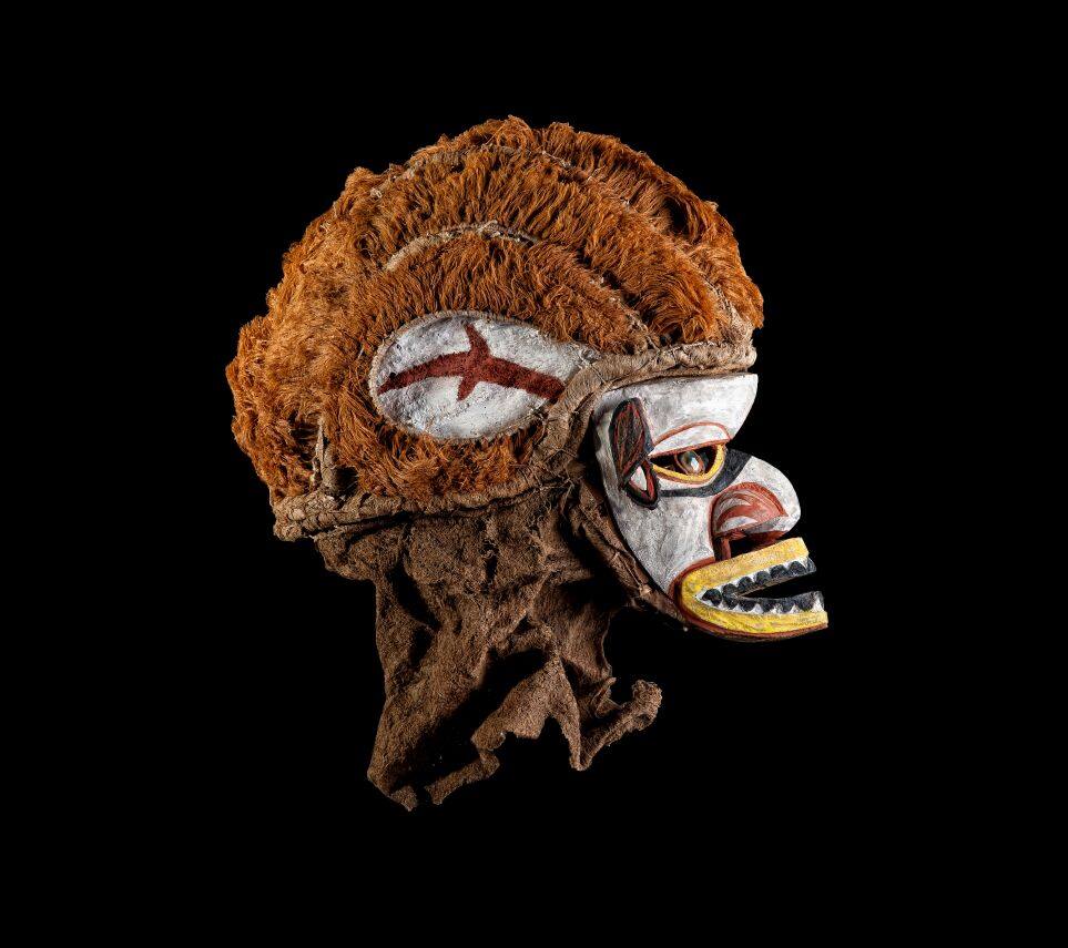 MediumRot, weiß, gelb und schwarz bemaltes Holz, Schneckenaugen aus den Verschlußdeckeln der Turbo petholatus, Raupenkamm, tapa-Behang, Kordel
