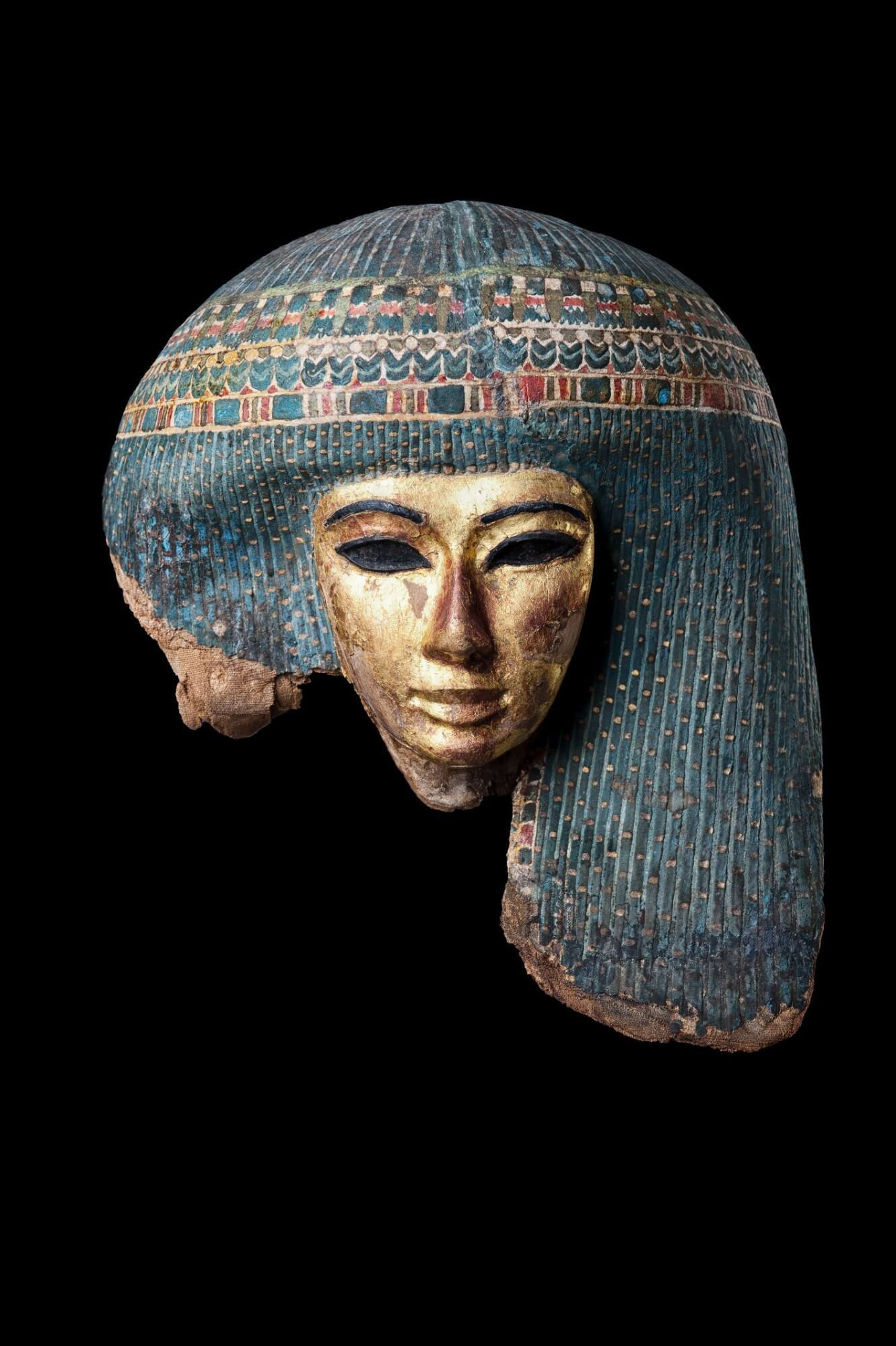 DescriptionOberer Teil einer Mumienhülle farbig gefasst und teilvergoldet. Die Augen waren ursprünglich mit Einlagen (heute verloren), die Perücke ist viermalig durchbohrt zum Befestigen eines Amuletts. Das Gesicht ist blattvergoldet und die Perücke sowie das dreibändige Diadem sind fein in verschiedenen Farben ausgearbeitet.DimensionsH x B: 28,5 × 26,5 cm (285 × 265 mm)