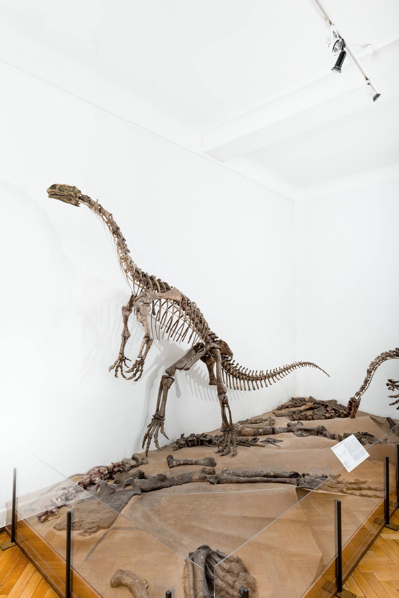 DescriptionPlateosaurus engelhardti (von Meyer 1837) (Reptilia, Dinosauria, Sauropodomorpha); Trias, Keuper, Trossingen-Formation, 206 Millionen Jahre; Obere Mühle bei Trossingen, Landkreis Tuttlingen, Baden-Württemberg; 1921 bis 1923 deutsch-amerikanische Kooperation, finanziert vom American Museum of Natural History, New York, ausgegraben und montiert durch von Huene und Wetzel; Inv.-Nr. GPIT-PV-30784 (syn. GPIT/RE/9386) und GPIT-PV-30785 (syn. GPIT/RE/7288).Zu sehen ist das vollständige Skelett eines Exemplars von Plateosaurus engelhardti aus dem Keuper von Trossingen. Im Jahr 1911 und 1912 begannen Professor Fraas und einige Mitarbeiter damit, die ersten Plateosaurusreste in Trossingen auszugraben. Später gruben – von 1921 bis 1923 – Professor von Huene und Mitarbeiter des Tübinger Geologisch-Paläontologischen Instituts in Trossingen die ersten kompletten Plateosaurus-Skelette aus. Aufgrund seiner großen Häufigkeit in Baden-Württemberg wurde der Plateosaurus auch schon mehrfach als "Schwäbischer Lindwurm" bezeichnet.