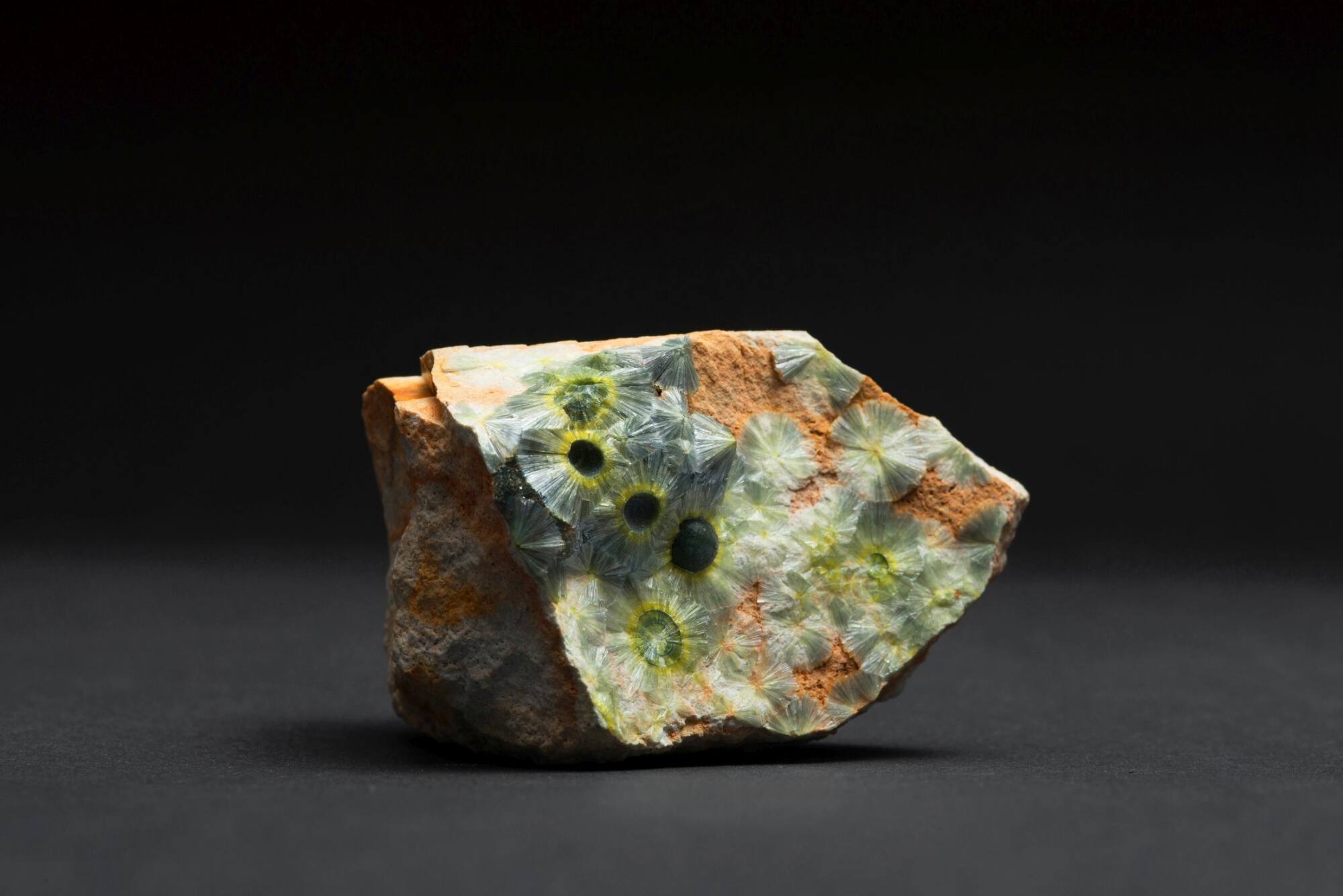 Die dünnen Wavelitt-Kristalle, die auf dem Trägerstein wachsen, ordnen sich strahlenförmig um zentrale Kugelformen an. Reiner Wavellit ist farblos, die meist grüne Färbung kommt durch Fremdbeimengung zustande.