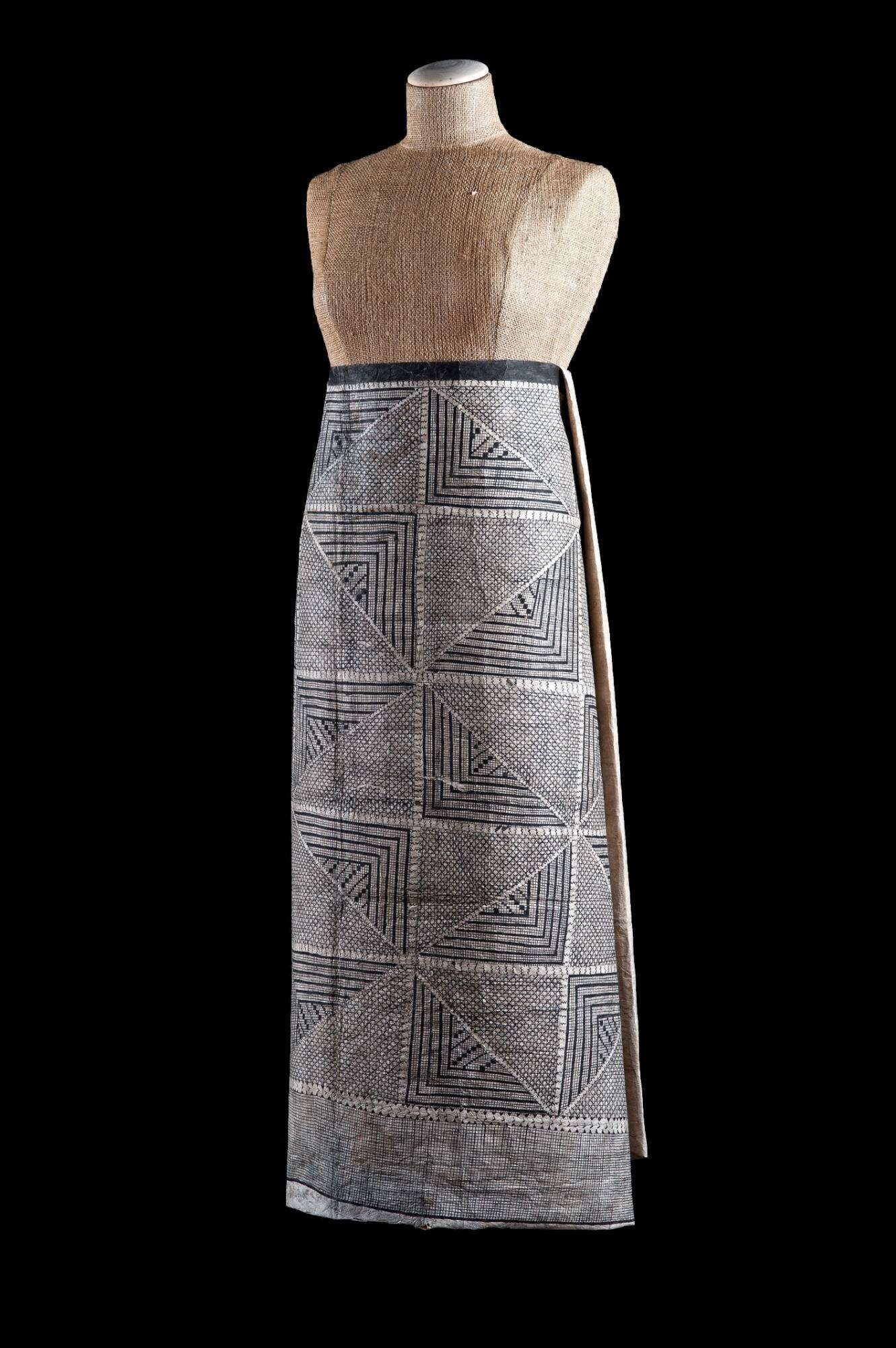 DescriptionRindenbaststoffe, die in West-Polynesien, von wo der abgebildete Stoff stammt, die einheimische Bezeichnung „Tapa“ oder „Siapo“ haben, werden aus der Bastschicht einer Baumrinde hergestellt, die überwiegend von jungen Papiermaulbeerbäumen stammt. Nachdem durch längeres Wässern der Baumrinde die Borkenschicht von der Bastschicht getrennt werden kann, werden die so erzielten Baststreifen mit Vierkant-Schlegeln auf einer Balkenunterlage zu dünnen Tüchern geschlagen. Diese werden anschließend in mehreren Schichten aufeinandergelegt und dann durch intensives Weiterschlagen zu dem erwünschten Rindenbaststoff miteinander verfilzt. Die Oberfläche des Stoffes wird anschließend mit aus Maniok gewonnener Stärke imprägniert, sodass es möglich wird, auch Muster mit so feinen Linien zu zeichnen, wie sie für die Insel Futuna typisch sind.