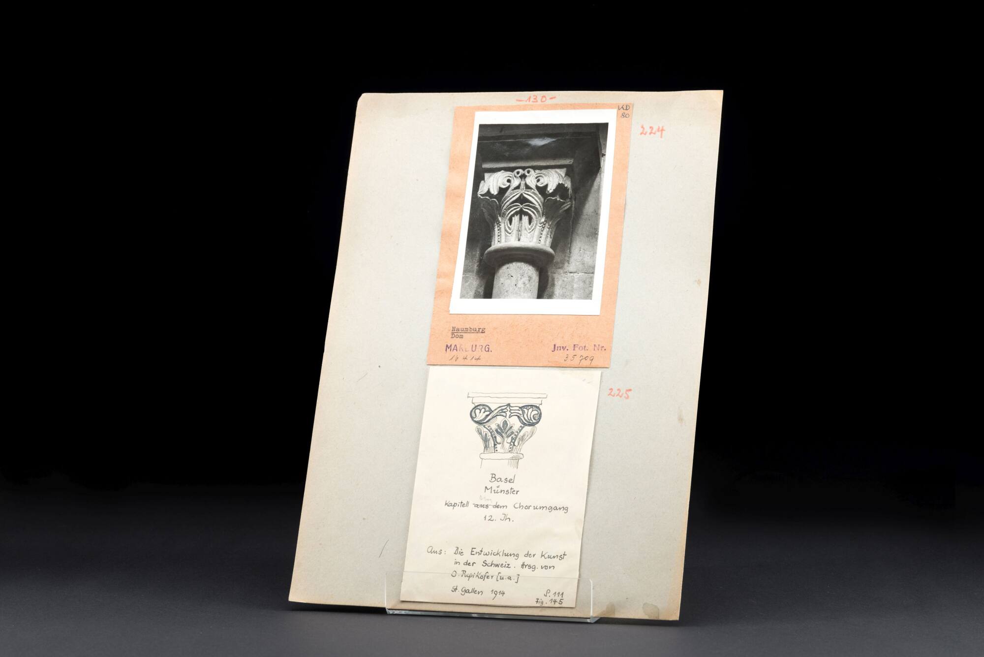 DescriptionFoto (Marburg, Aufnahme-Nr. 16.415) eines Kapitells (1201/1300) aus dem Naumburger Dom, Ostchor, und Zeichnung eines Kapitells aus dem Basler Münster. Auf einem Bogen, alt montiert, mit Quellenangabe der benutzten Literatur.Object numberKHI-Fo-3